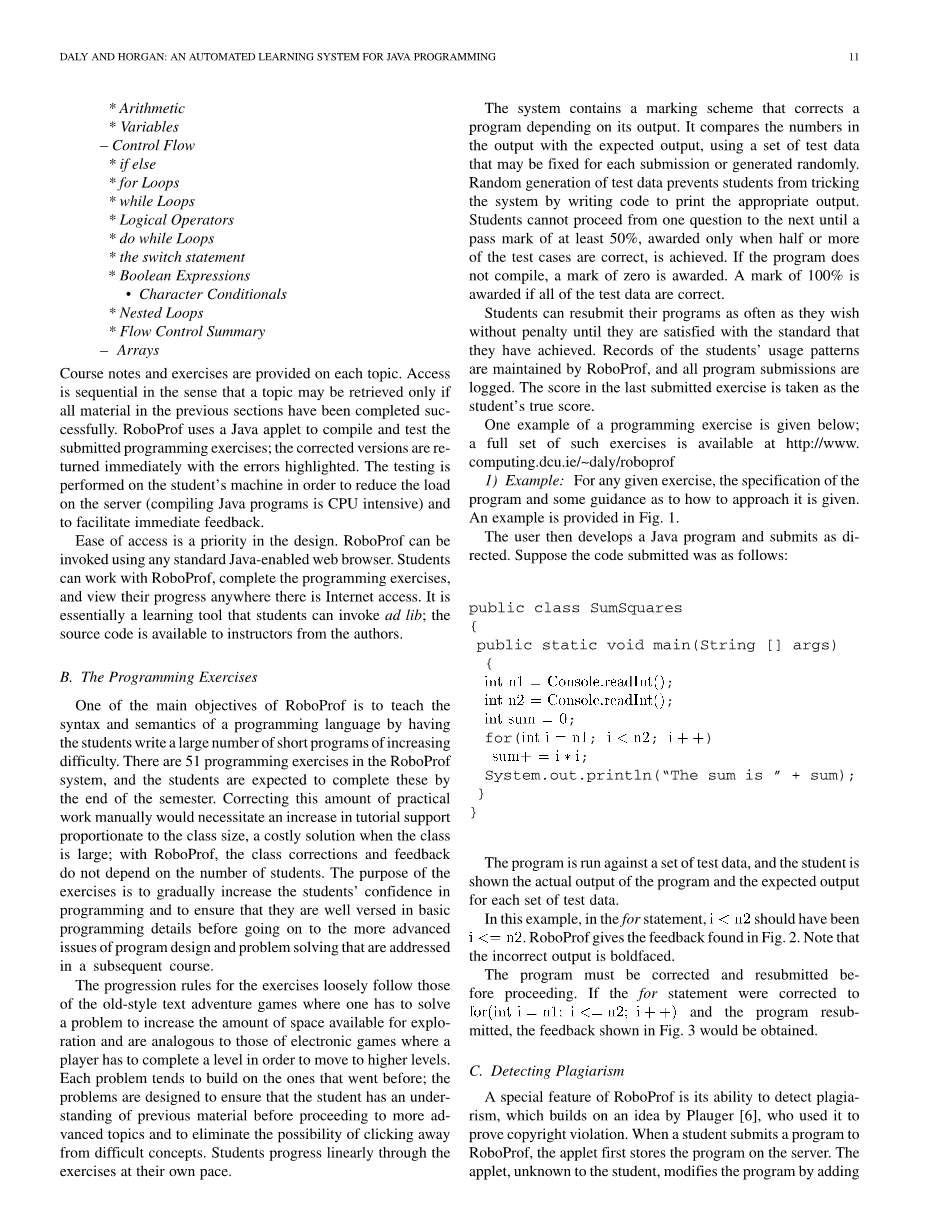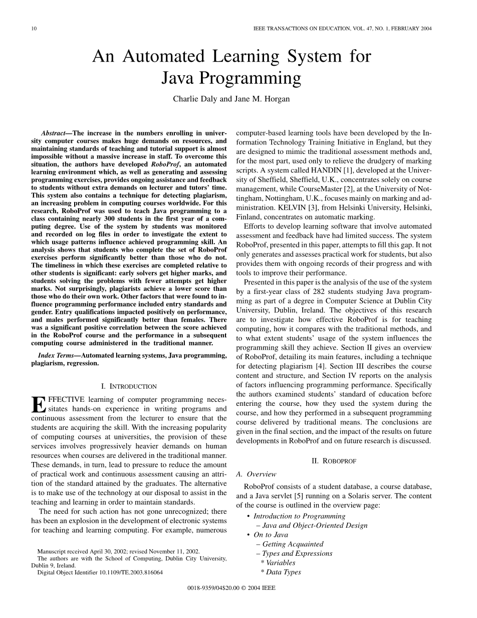 RoboProf的第二节概述详细介绍了其主要功能,包括一项用于检测抄袭[4]的技术。 第三节描述了该课程内容和结构,第四节报告分析影响编程性能的因素。 特别指出的是,作者在开展课题之前曾研究过学生的教育水平,他们在课程中对该系统的使用方式,以及后续以传统方式提供的编程课程中的表现。研究结论是在文章最后一节给出,并讨论了结果对RoboProf以后发展的影响和将来的研究方向。