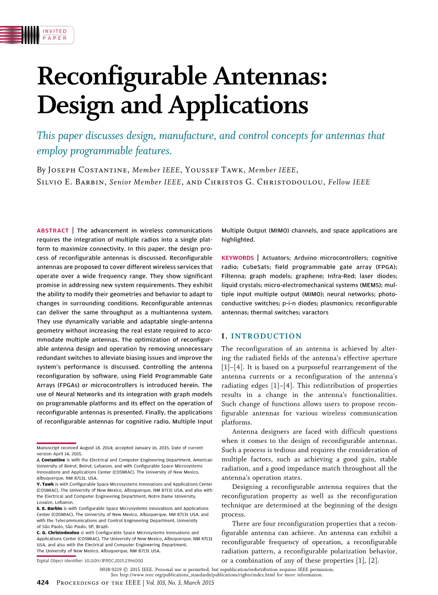 一个天线的重构是由变更这些天线的有效口径的辐射场得到的。它基于天线电流或者重构天线辐射边缘的有目的的安排。性能结果的再分配改变着天线的功能。这些功能的改变允许使用者提出用可重构天线作多种多样的无线通信平台。
