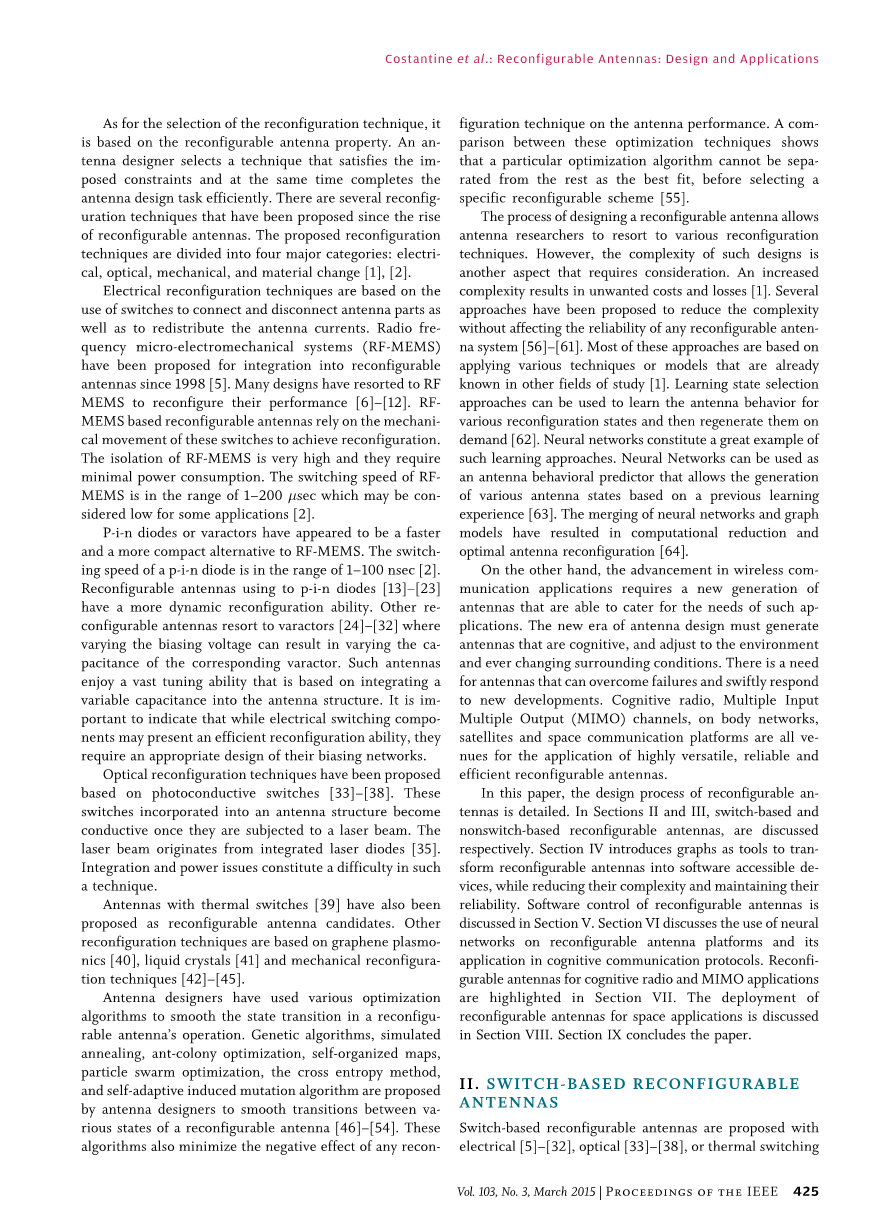 本文中,可重构天线的设计过程详细写出了。在第二第三部分中,交换式和非交换式可重构天线被分别地讨论。第四部分介绍了图表作为工具把可重构天线转化成软件访问设备,同时减少它们的复杂性并且得到它们的可靠性。可重构天线的软件控制在第五部分被讨论。第六部分讨论了神经网络在可重构天线平台的使用和它在认知通信协议里的应用。感知无线电和多端输入多端输出应用上的可重构天线在第七部分重点讨论。部署用来空间利用的可重构天线在第八部分被讨论。第九部分总结本文。
