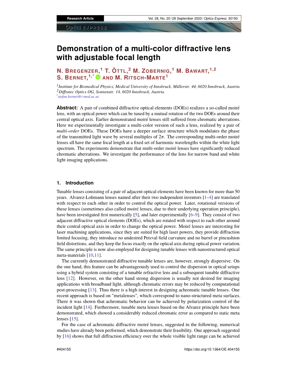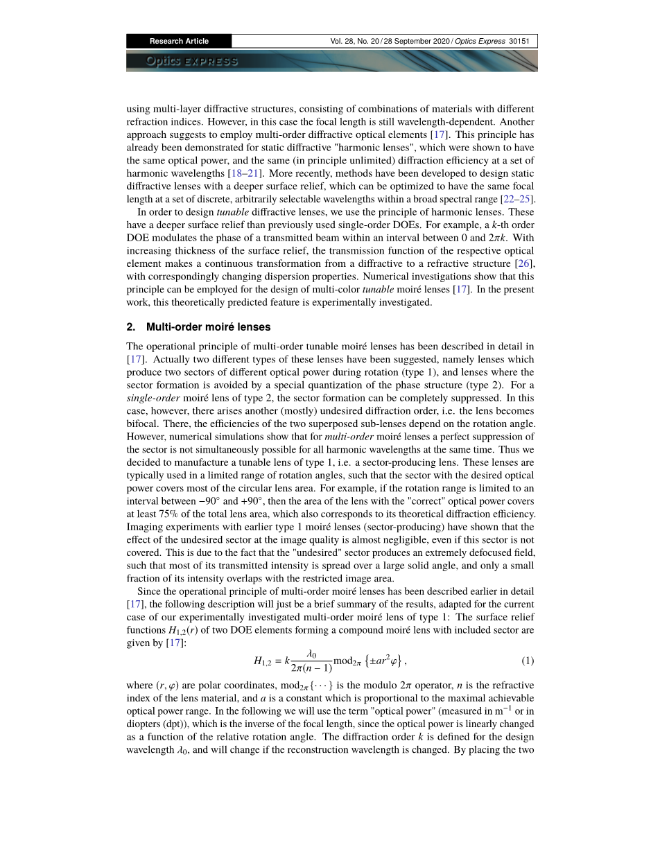 using multi-layer diffractive structures, consisting of combinations of materials with different refraction indices. However, in this case the focal length is still wavelength-dependent. Another approach suggests to employ multi-order diffractive optical elements [17]. This principle has already been demonstrated for static diffractive 'harmonic lenses', which were shown to have the same optical power, and the same (in principle unlimited) diffraction efficiency at a set of harmonic wavelengths [1821]. More recently, methods have been developed to design s
