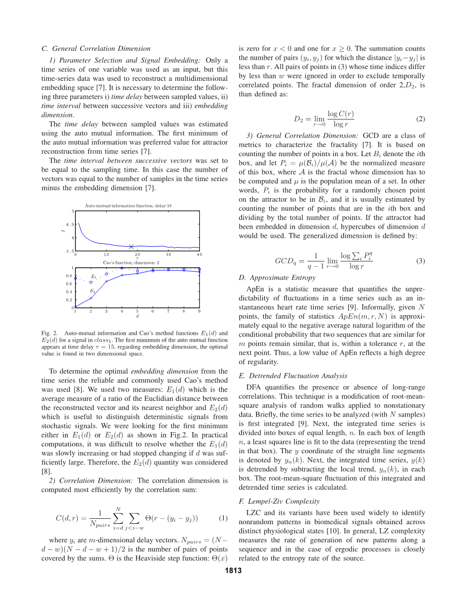 通过10次实验和误差的方法发现,最佳的参数设置为近似熵,去趋势波动分析和盒计数法。以近似熵为例,公差参数r,在保持固定模式的长度m时增加了0.05。考虑去趋势波动分析,定义两个去趋势波动分析曲线的斜率的参数在每次运行增加了4个。最后,盒计数法在dim BFD在每个运行尺寸递增1。导致在10次运行中最小p值的最终参数如下: 一般关联维数:为每个信号嵌入维度变量,应用Cao的方法;时间延迟:每个信号的变量,自动交互信息应用;近似熵: 公差r = 0.1,模式的长度 m = 2;去趋势波动分析:快速= 2,中= 32,慢= 64;盒计数法:尺寸dim BFD = 5;压缩算法的复杂性:采用二进制编码。