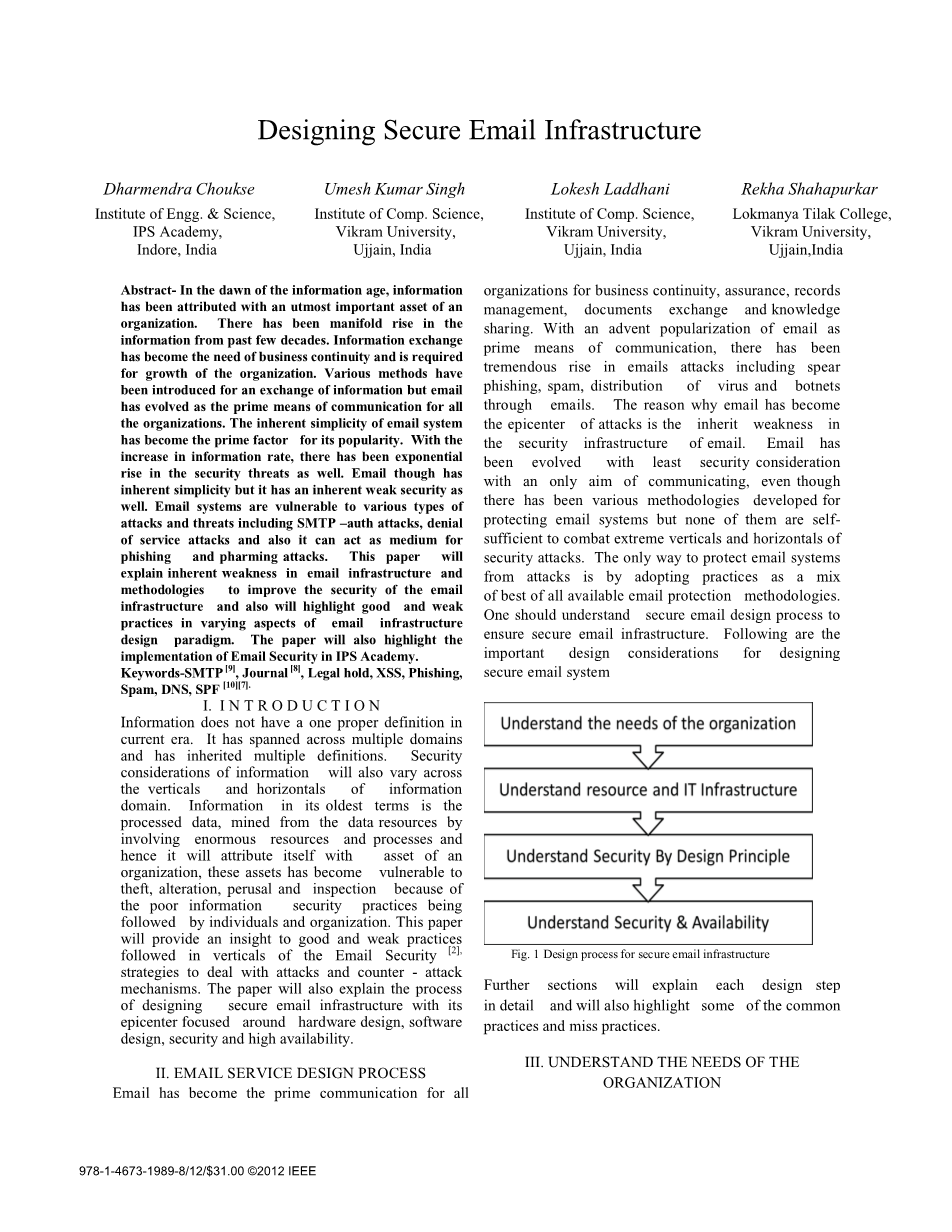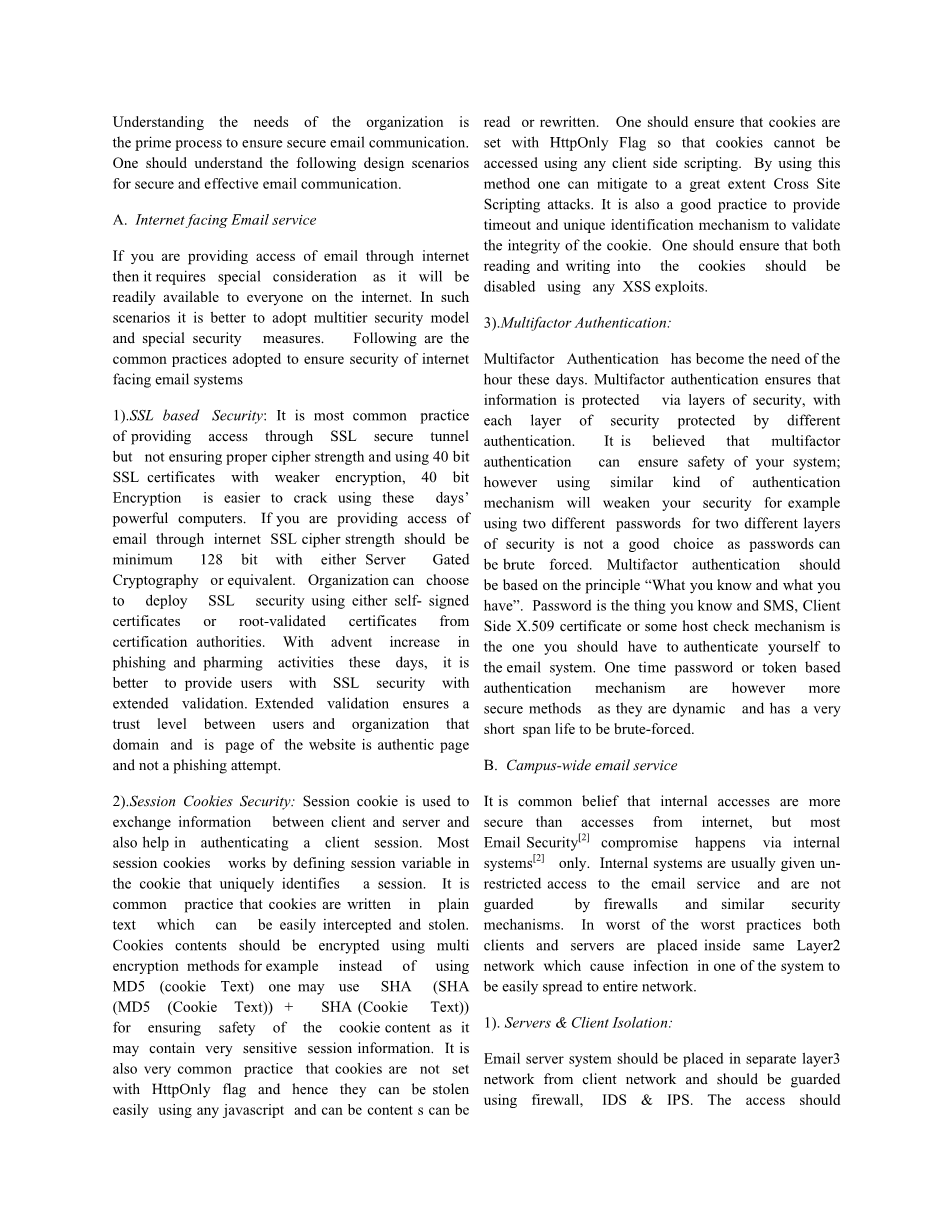 信息时代来临,信息被认为是一个机构最重要的资产。 在过去几十年里,信息有着多面的提升。 信息交流已经为业务连续性所需要并且是机构成长所必需的,为交换信息,出现了各种方法,但是电子邮件已经演变为所有机构的主要通信手段。 电子邮件系统固有的简单性是其流行的主要因素。 随着信息速率的提高,安全威胁也呈现出指数级的增长。电子邮件在有其简单性的同时,其安全性低下也是一个问题。 电子邮件系统容易受到各种类型的攻击和威胁例如SMTP -auth攻击,分布式拒绝服务攻击,它也可以作为网络钓鱼的媒介。 本文将介绍电子邮件基础架构和方法的固有缺点以便提高电子邮件基础架构的安全性,也将突出在电子邮件基础架构的各个方面的设计范例的优劣。 本文还将重点介绍IPS学院在电子邮件安全的实现情况。