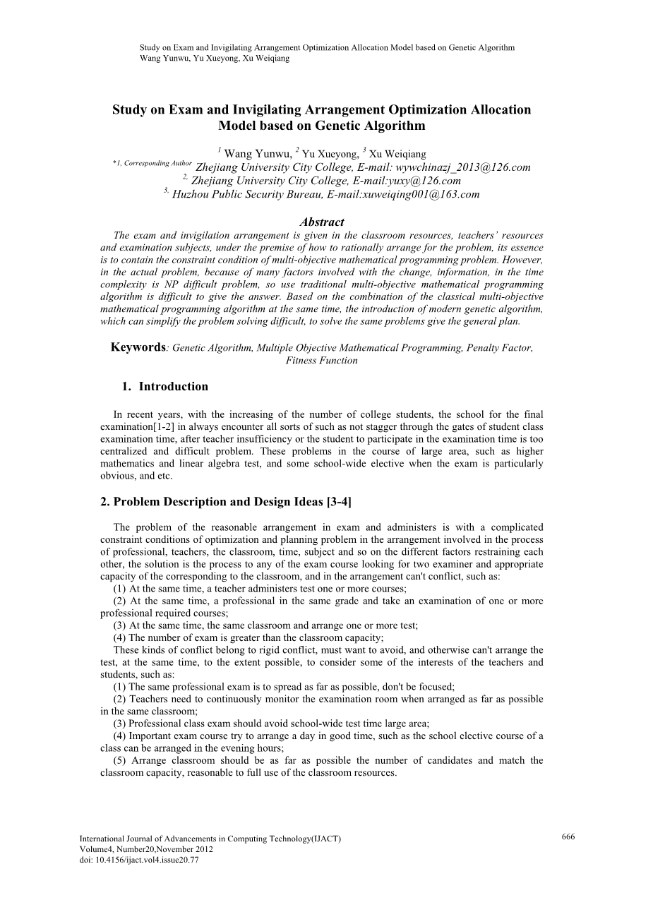 摘要:考试监考安排基于教室资源、教师资源和考试课程,在怎样合理安排问题的前提下,其实质是包含多目标数学编程问题的约束条件。然而,在实际的问题中,因为变化涉及的很多因素,在时间复杂度的信息是NP难的问题,所以用传统的多目标数学规划算法很难给出答案。同时基于经典多目标数学规划算法的结合,采用现代遗传算法,它可以简化处理困难问题的难度,对于解决同样的问题给予了总体规划。