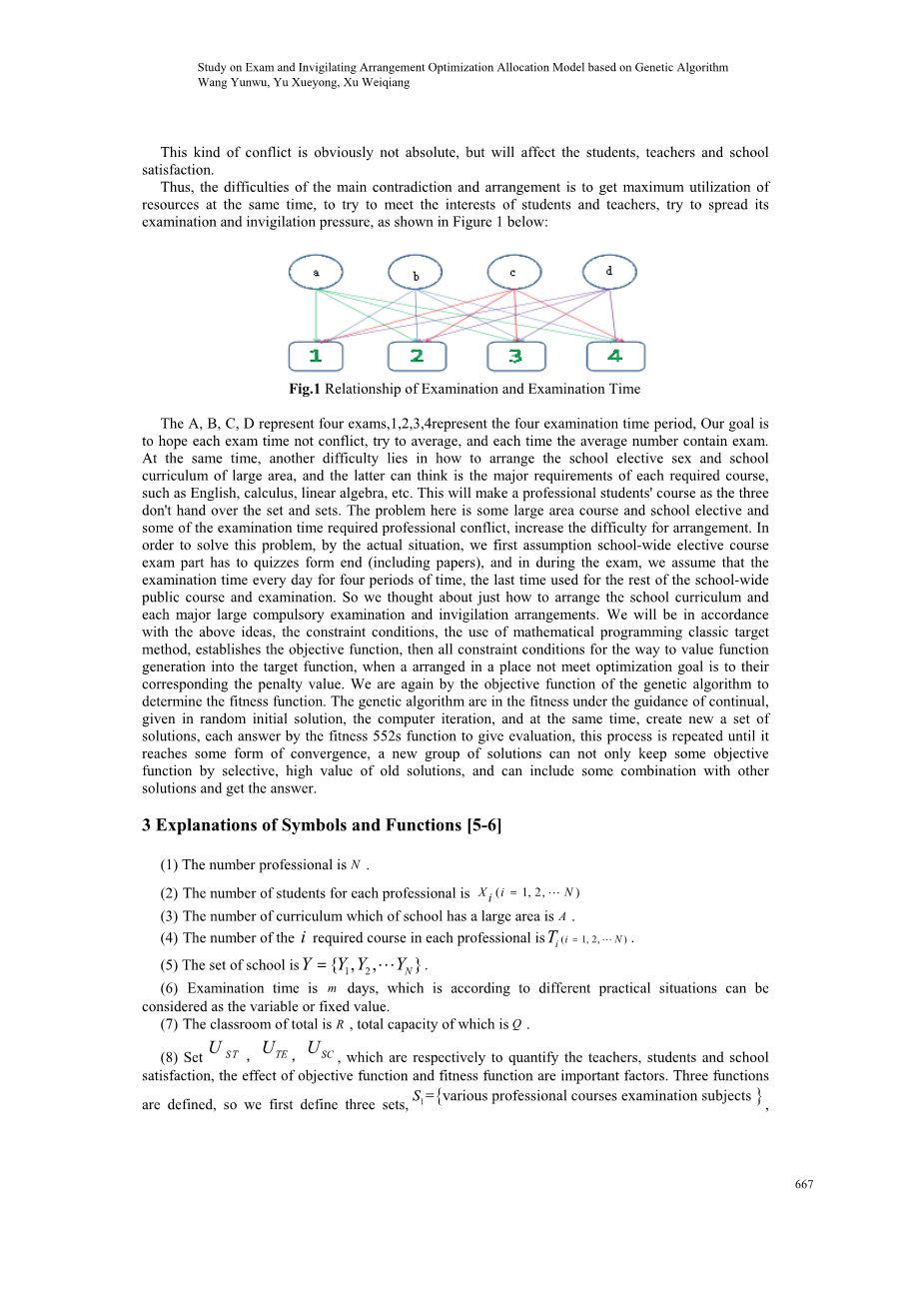 - 设,它们分别以量化教师,学生和学校的满意度,目标函数和适应度函数的作用是很重要的因素。三大功能被定义的,所以我们首先定义三组,{各专业课程考试科目},{大面积考试科目},{考试时间段},,考试进行由m天代表。所给标志,它的意思是测试的J时间段,例如代表第一天的第一时间段。