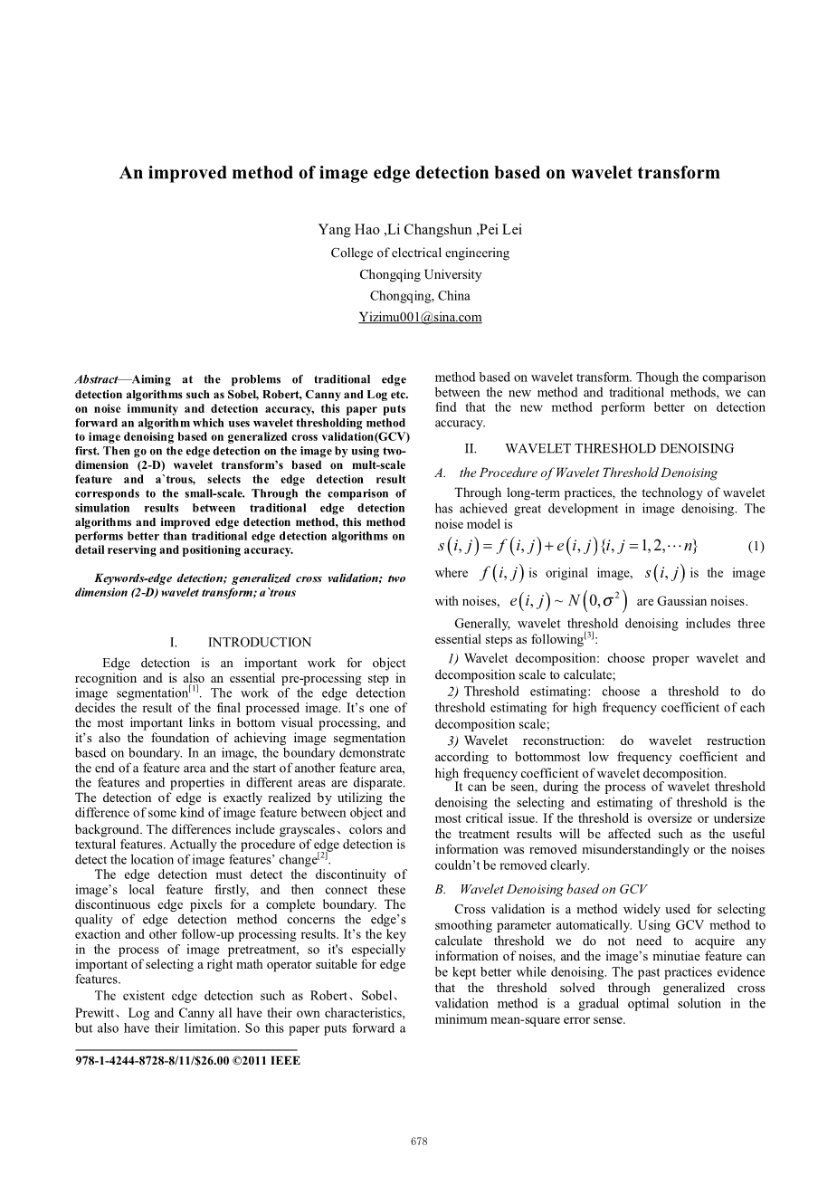 关键词边缘检测; 广义交叉验证; 二维(2-D)小波变换; a`trous