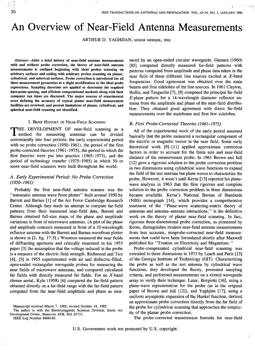 早期的所有实验工作基本上都假设探针测量了近场中电矢量或磁矢量的矩形分量。一些早期的理论著作应用了近似修正因子用来说明测量探针的有限尺寸和近场距离,早期的所有实验工作基本上都假设探针测量了近场中电矢量或磁矢量的矩形分量。1961年Brown和Jull用柱面波函数扩展测试天线的场,但用平面波来表征探针,给出了二维探针修正问题的严格解决方案。然而,直到1963年Kerns报告了他的平面波分析,三维探针修正问题的第一个严格和完整的解决方案才成为可能。科恩斯的国家标准局(NBS)专论,提供了“天线和天线的平面波散射矩阵理论——天线相互作用”的综合论述,这是平面近场扫描理论的权威著作。事实上,Kerns首创的严格的三维探针校正将现代近场天线测量与不太精确的、未经探针校正的近场测量区分开来,后者可能是在麦克斯韦发表他的《电与磁》后不久制定的。