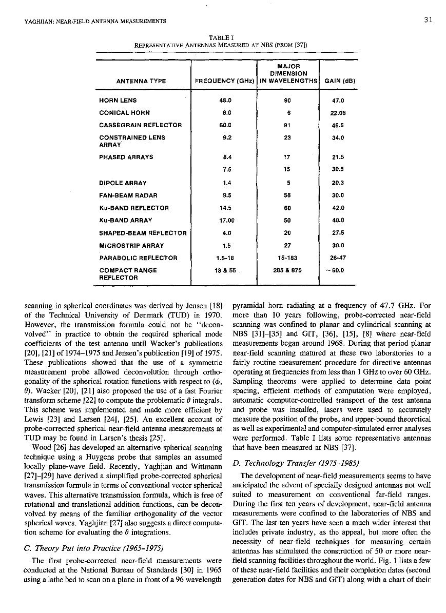1965年,在美国国家标准局进行了第一次经探头修正的近场测量,使用车床在96个波长的角锥喇叭前扫描,辐射频率为47.7 GHz。在此后的十多年里,经过探头校正的近场扫描仅限于NBS和GIT的平面和圆柱扫描,而这两个地方的近场测量是在1968年前后开始的。在此期间,这两个实验室对平面近场扫描逐渐成熟,对工作频率在1 GHz以下到60 GHz以上的定向天线进行了相对常规的测量。应用抽样定理确定数据点间距,采用有效的计算方法,安装了计算机控制的自动传输测试天线和探头。用激光精确测量了探针的位置,并给出了上限理论,并进行了实验和计算机模拟误差分析。表一列出了在国家统计局测量过的一些有代表性的天线。