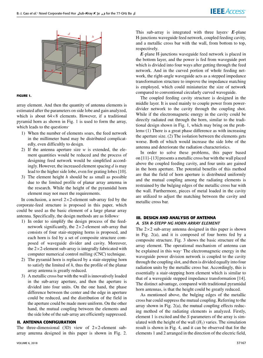 在图2(a)中给出了本文设计的2times;2子阵天线,它由四个喇叭组成复合结构。图3显示了该的基本结构数组元素。天线的运行机制可以用这种方式解释:电磁能量波导功率分配网络耦合到腔体通过耦合槽,然后分成四个辐射单元由金属横杆组成。因此,这是基本上是阶梯式喇叭元件,类似于波导步进阻抗变换[14]。与传统的锥形相比,具有明显的优势喇叭天线,是高度可以大大降低。