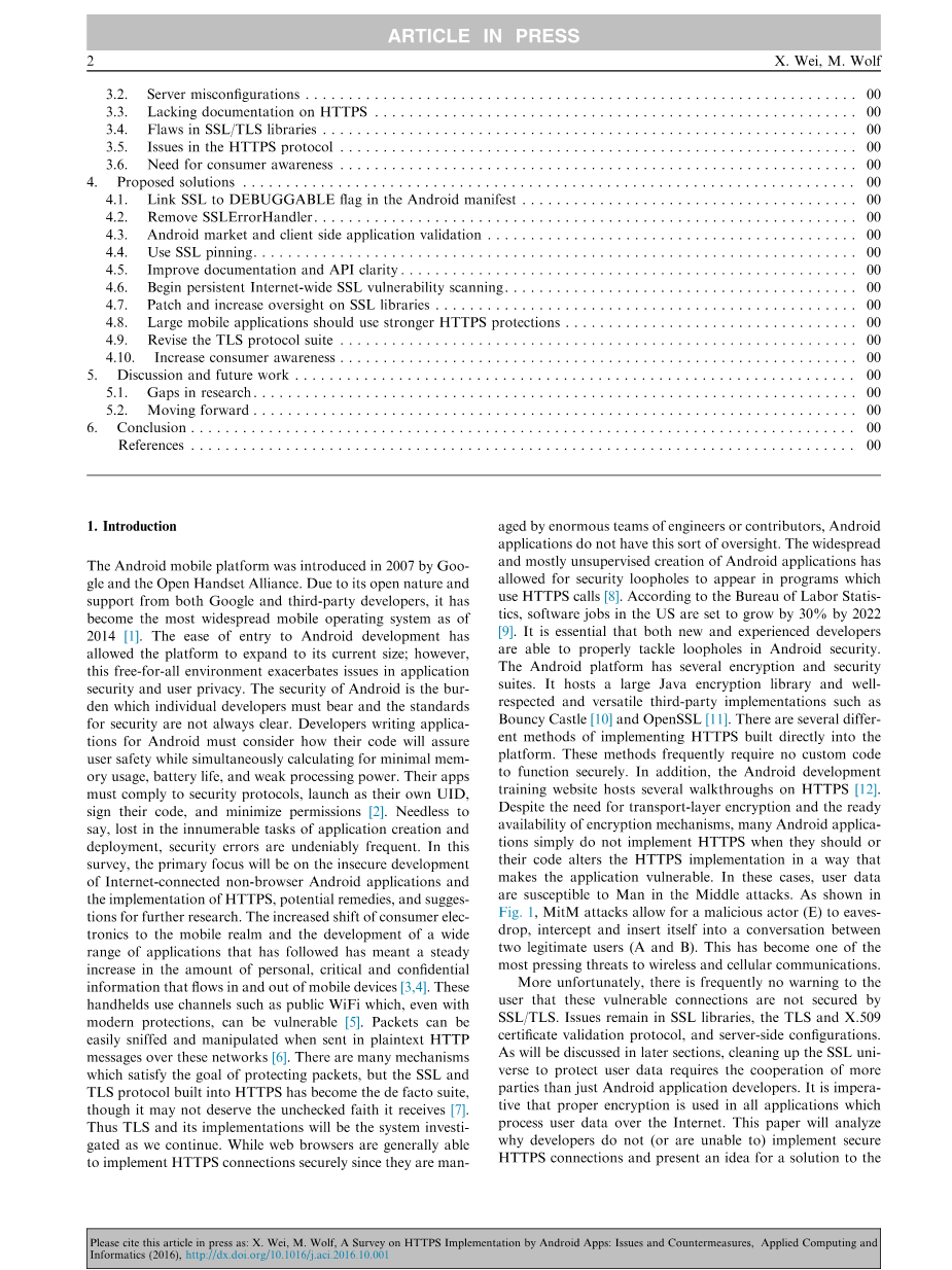 在本节中,我们将研究有损SSL/TLS实施安全性的问题,特别是基于Android的设备。首先,我们将介绍使用当前Android HTTPS实现的SSL不安全的主要原因。尽管开发商希望确保应用程序的唯一指导是Android系统中的一些基本框架,但安全性必须通过手动将自定义安全功能集成到项目中,同时保留功能和连贯的形式。这个过程可能是临时的,容易出错,重复和不精确[43],如上一节所示,漏洞和差错是猖獗和积极利用的。修补这些缺陷的第一步是确定其起源。存在根植于移动应用开发范例,服务器配置,Android文档,SSL/TLS库,SSL TLS协议和应用程序消费者的问题。广泛的研究已经确定了每个因素的根本原因。本节将进一步调查这些原因。