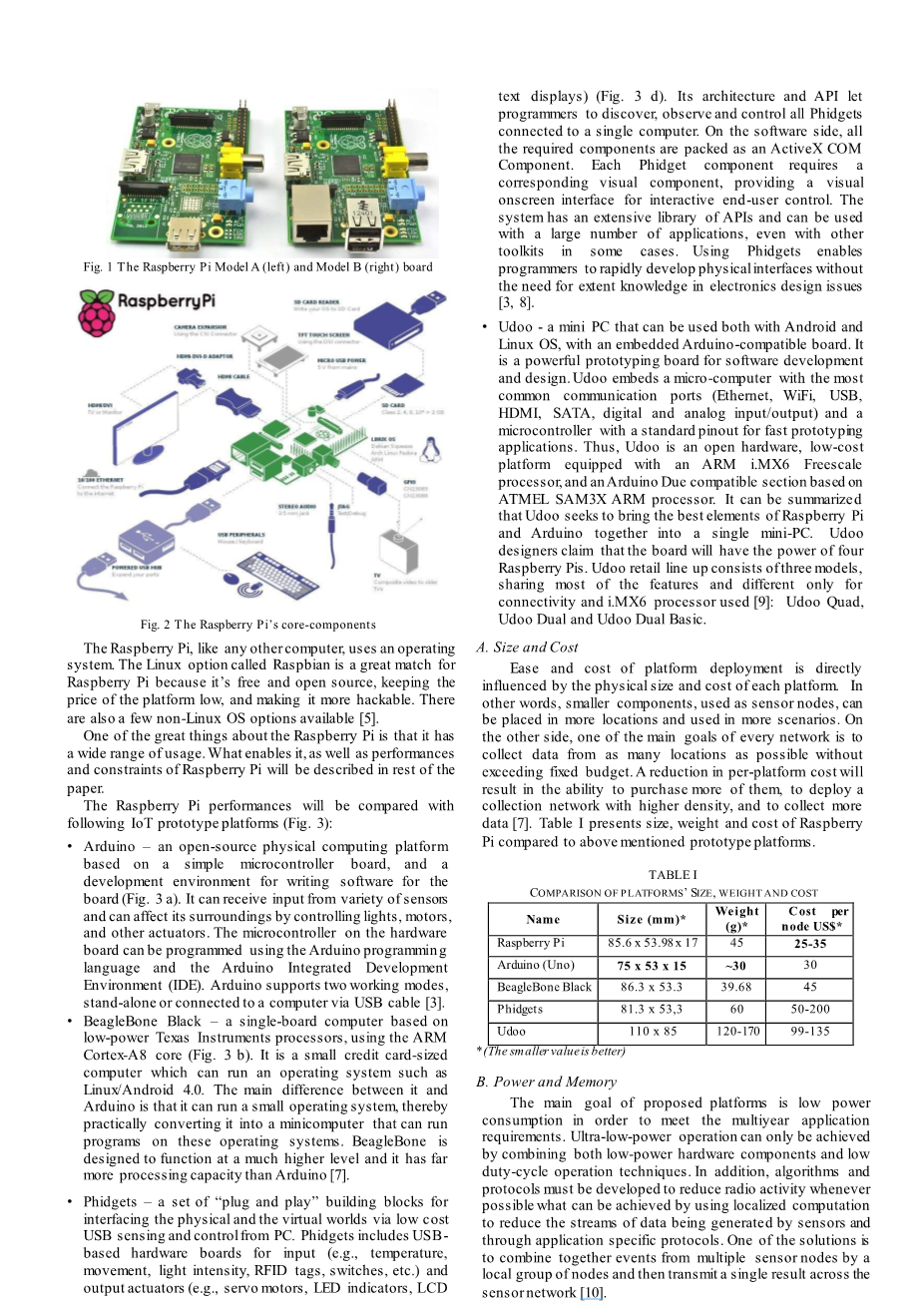 平台部署的轻松和成本直接受每个平台的物理尺寸和成本的影响。 在换句话说,较小的组件,用作传感器节点,可以放置在更多的位置,并在更多的场景中使用。 上另一方面,每个网络的主要目标之一就是从尽可能多的位置收集数据,而不需要超过固定预算。 每平台成本的降低将会降低,导致能够购买更多的部署,部署收集网络密度较高,并收集更多数据[7]。 表I列出了树莓派与上述原型平台在大小,重量和成本放方面的对比。