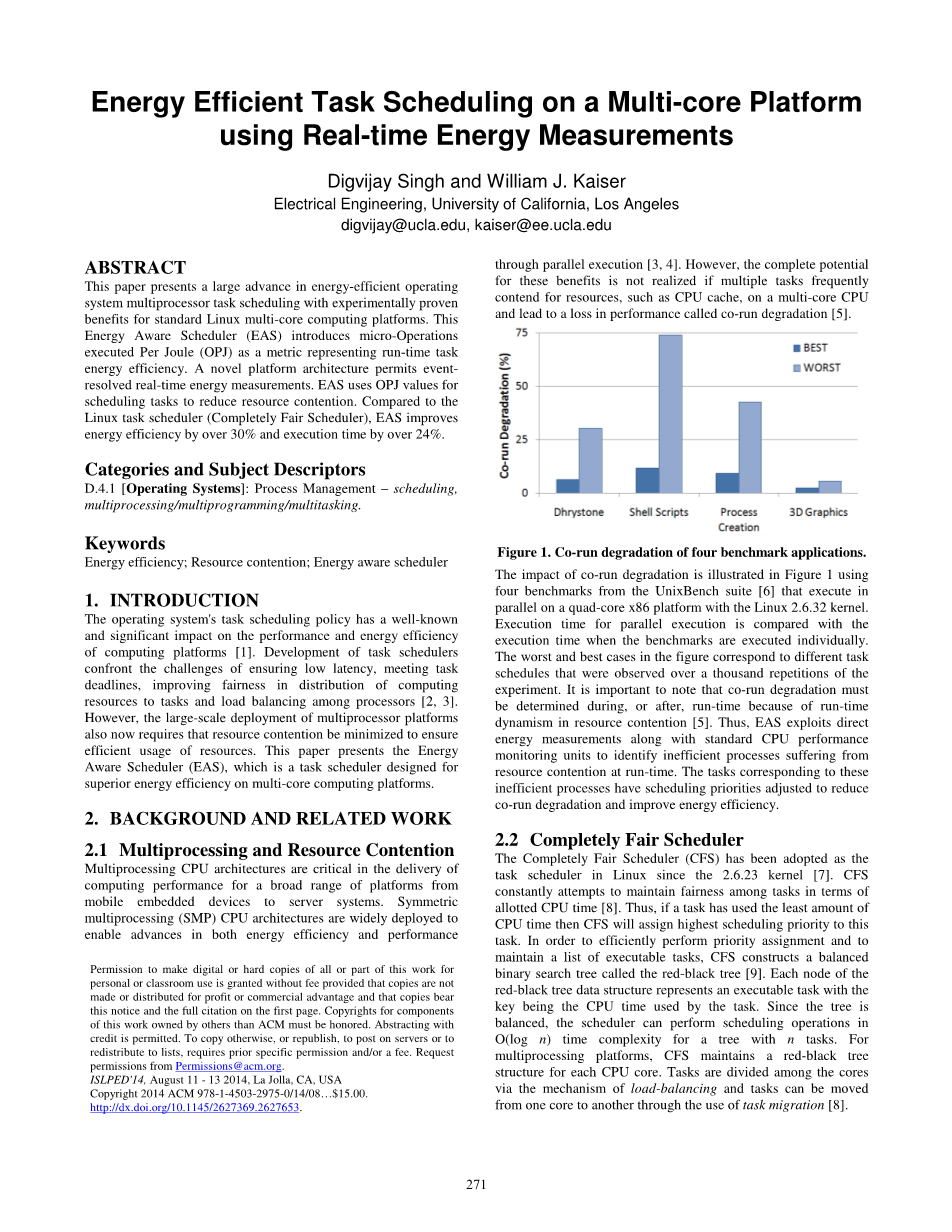 本文展现了节能操作系统在多处理器任务调度方面上的巨大进步,并通过在标准Linux多核计算平台上进行实验证明。能量感知调度(EAS)引入以每焦耳能量(OPJ)的微操作的度量来表示运行时任务能量效率。一种新颖的架构平台允许对事件解析实时能量测量。能量感知调度通过焦耳能量值来调度任务以减少能耗。与Linux任务调度程序(完全公平调度)相比,EAS提高了超过30%的能量效率,执行时间多出24%。