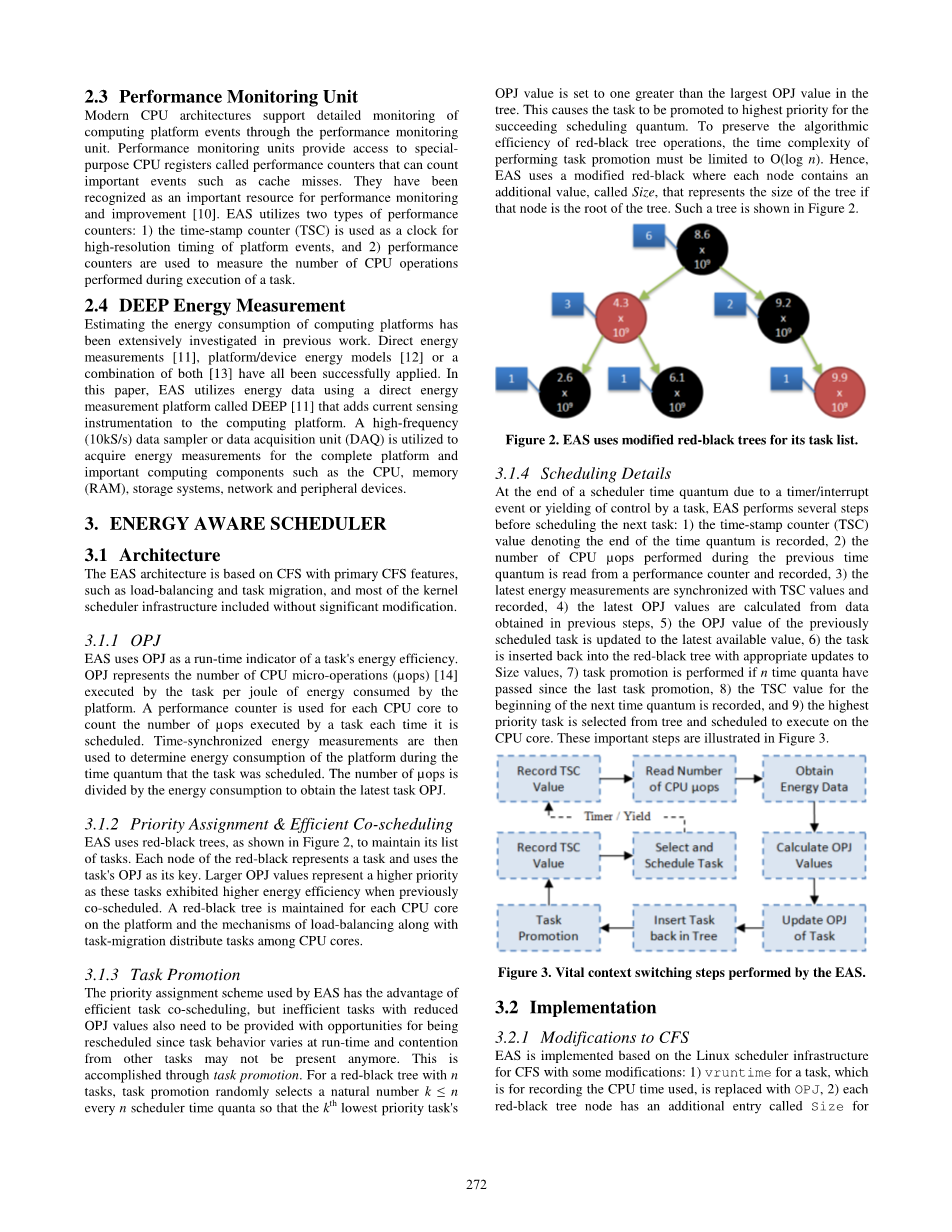 现代CPU架构通过性能监控单元支持对计算平台事件的详细监控。 性能监视单元提供访问专用CPU寄存器,称为性能计数器,可以计数重要事件,如高速缓存未命中。 它们被认为是绩效监测和改进的重要资源[10]。 EAS使用两种类型的性能计数器:1)时间戳计数器(TSC)用作平台事件高分辨率定时的时钟,2)性能计数器用于测量执行中执行的CPU操作次数 一个任务。