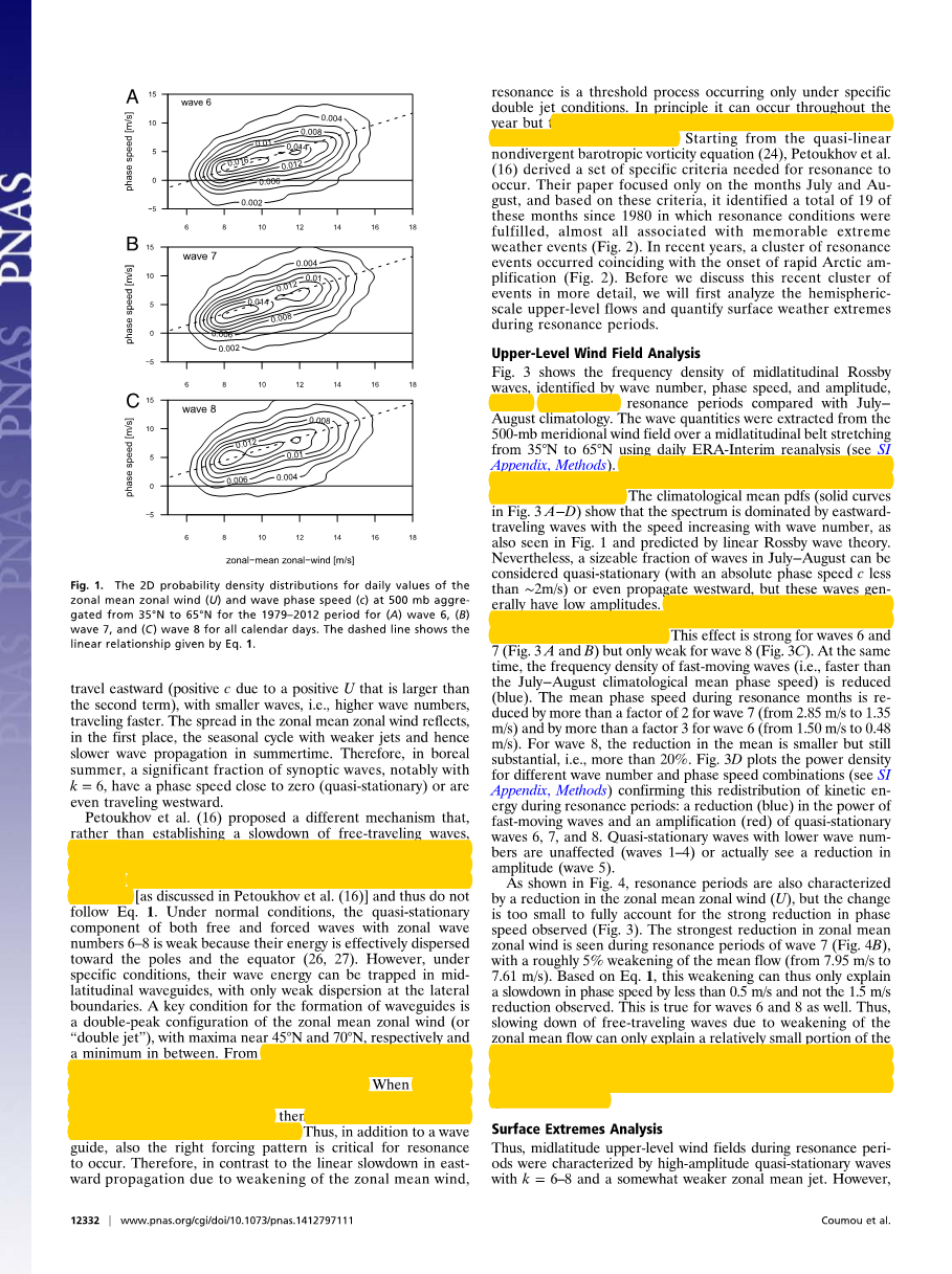 其中为纬向平均纬向风,为罗斯贝参数,和分别为纬向和经向波数,因此方程[1]显示了任何波数的自由波的速度与纬向平均纬向风速成线性比例,观测风场的光谱分析显示,对于第一阶,等于6-8的大气波(静态分量通常很小)确实遵循方程[1]给出的线性关系,这里我们使用ERA-interim数据(25)中的风场,该数据将观测风场与气象预报模型结合起来生成全球网格化数据,图1绘制了中纬度500毫巴波数为6-8的纬向平均纬向风和相速每日值概率密度分布(参考SI附录,方法)(平均35°N到65°N),通过使用一年中每天的经向风的光谱分析来追踪波的相位确定相速(参考SI附录,方法),显然,在大多数情况下,大气波向东传播(由于正U大于第二项而为正c),波越小,波数越大,波传播得越快,纬向平均纬向风的传播首先反映了较弱的射流的季节周期,因此夏季波传播得慢。因此,在北方夏季,很大一部分大气波,尤其是k=6,相速接近于零甚至向西传播。