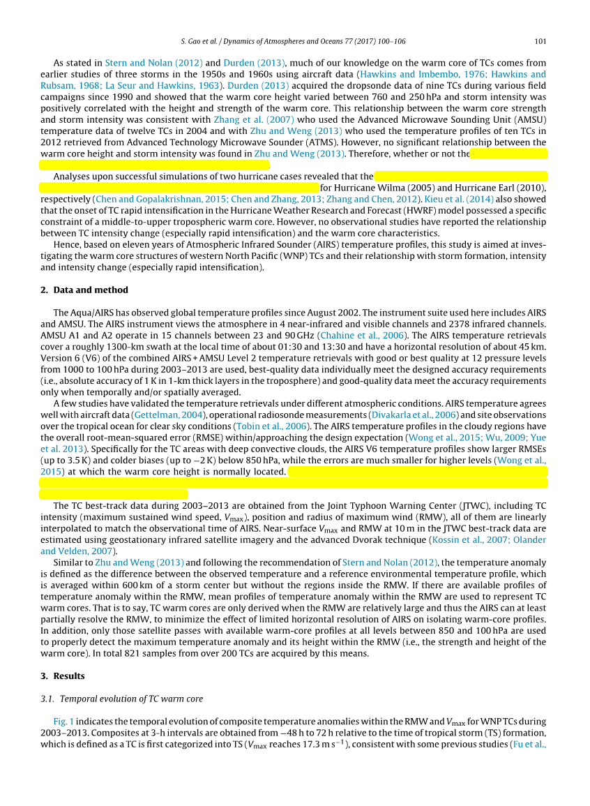 正如Stern和Nolan(2012)以及Durden(2013)所述,我们对TC暖心结构的了解来自20世纪50年代和60年代使用飞机数据的三次风暴研究(Hawkins和Imbembo,1976; Hawkins和Rubsam1968年; La Seur和Hawkins,1963年)。自1990年以来,Durden(2013)在各种场地活动中获得了9个TC的下降探测器数据,结果表明,暖核高度在760和250 hPa之间变化,风暴强度与暖核的高度和强度呈正相关。这种暖核强度与风暴强度之间的关系与张等人一致。2007),张等人2004年使用了12个TC的高级微波探测单元(AMSU)温度数据,2012年以及朱和翁(2013)使用了从先进技术微波探测器(ATMS)获得的10个TC的温度曲线。然而,朱和翁(2013)没有发现暖核高度和风暴强度之间的显着关系。因此,是否暖核高度与TC强度有关仍然是一个悬而未决的问题。