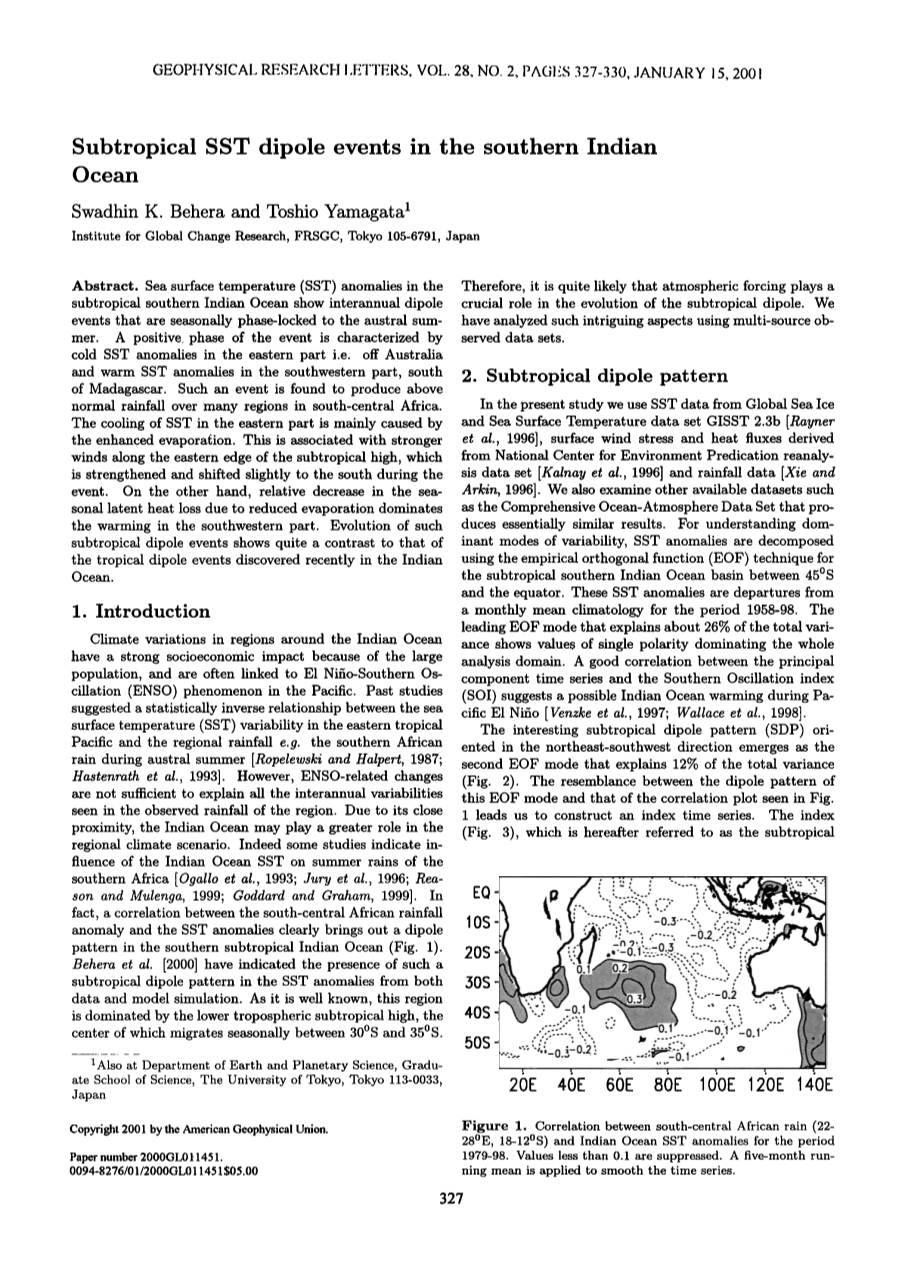 由于人口众多,印度洋周围地区的气候变化对社会经济产生了巨大的影响,并且常常与太平洋的厄尔尼诺-南涛动现象(ENSO)有关。过去的研究表明,热带太平洋东部海面温度(SST)的变化与区域降雨之间存在统计上的负相关关系,例如南半球夏季非洲南部降雨[Ropelewski and Halpert, 1987;Hastenrath等人,1993]。然而,enso相关的变化并不足以解释该地区观测到的降雨的所有年际变化。由于地理位置接近,印度洋可能在区域气候变化中发挥更大的作用。一些研究的确表明了印度洋海温对非洲南部夏季降雨的影响[Ogallo et al.,1993; Jury et al.,1996; Reason and Mulenga,1999; Goddard and Graham,1999]。事实上,非洲中南部降雨异常与海温异常的相关清晰地在副热带印度洋南部呈现出偶极子模态(图1)。Behera等人[2000]指出这样一海温异常的偶极子模态在数据和模式模拟中都存在。众所周知,这个区域被对流层低层的副热带高压控制,副高中心在30°S和35°S之间有季节性移动。因此,大气强迫作用很有可能在副热带偶极子的演化过程中起关键作用。我们使用各种来源的观测数据集来分析了这些有趣的方面。