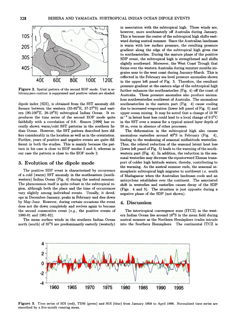 有趣的副热带偶极子模态(SDP)以东北-西南方向出现在EOF第二模态,解释了12%的总方差(图2)。EOF模式的偶极子模态和图1相关图的偶极子之间的相似性使我们构建了一个时间指数序列。该指数(图3),以下简称副热带偶极子指数(SDI),从西部(55 - 65°E,37-27°S)和东部(90 - 100°E,28-18°S)副热带印度洋海温异常的差异获得。它非常准确地再现了第二个EOF模态的时间序列,相关系数为0.8。Reason[1999]最近在南印度洋展示出温暖/寒冷的海温模态。然而,这里描述的海温模态在位置和方向上有很大的不同。此外,在这两项研究中,多年的正负事件是完全不同的。这主要是因为他的模式接近EOF第3和第4模态,而我们的模式接近EOF第2模态。