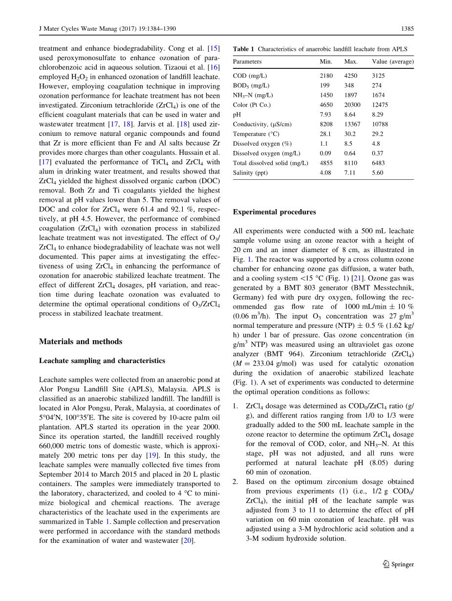 垃圾渗滤液需要一种有效的处理技术,以便在最终排放前将高浓度污染物降低到可接受的水平。垃圾渗滤液处理的物理、化学和生物处理技术已经开展[7,9 - 11]。臭氧化是一种可用于水和废水处理的化学工艺。臭氧(O3)因其对有机物的强氧化作用而受到渗滤液处理的重视[8,10,12]。然而,臭氧氧化处理稳定渗滤液的性能相对较低,但可以通过使用额外的先进材料和技术来提高其性能。在文献中,已经进行了一些先进的臭氧化应用。Mehrjouei等[10-14]综述了光催化臭氧化在垃圾和废水处理中的应用,Abu Amr等[10-14]利用芬顿和过硫酸盐改善臭氧化,用于稳定渗滤液处理,提高生物降解性。Cong等[15]采用过氧单硫酸盐增强对氯苯甲酸在水溶液中的臭氧化。Tizaoui等人利用H2O2对垃圾渗滤液进行强化臭氧化处理。然而,利用混凝技术改善渗滤液臭氧化性能的研究还没有进行。四氯化锆(ZrCl4)是一种高效的混凝材料,可用于水和废水处理[17,18]。Jarvis等人[18]使用锆去除天然有机化合物,发现Zr比铁和铝盐更有效,因为Zr比其他凝聚剂提供更多的电荷。Hussain等人[17]对TiCl4和ZrCl4与明矾在饮用水处理中的性能进行了评价,结果表明,ZrCl4对溶解性有机碳(DOC)的去除率最高。在pH值低于5时,Zr和Ti两种混凝剂的去除率最高。在pH为4.5时,ZrC4的DOC去除率为61.4 %,颜色去除率为92.1%。然而,在稳定渗滤液处理中,没有研究ZrCl4与臭氧化联合凝血的性能。O3/ ZrCl4对提高渗滤液生物降解性的作用还没有很好的文献记载。本文旨在研究利用ZrCl4提高厌氧稳定渗滤液臭氧化处理性能的有效性。通过对渗滤液臭氧化过程中不同ZrCl4用量、pH值和反应时间的影响进行评价,确定O3/ZrCl4工艺在稳定渗滤液处理中的最佳操作条件。