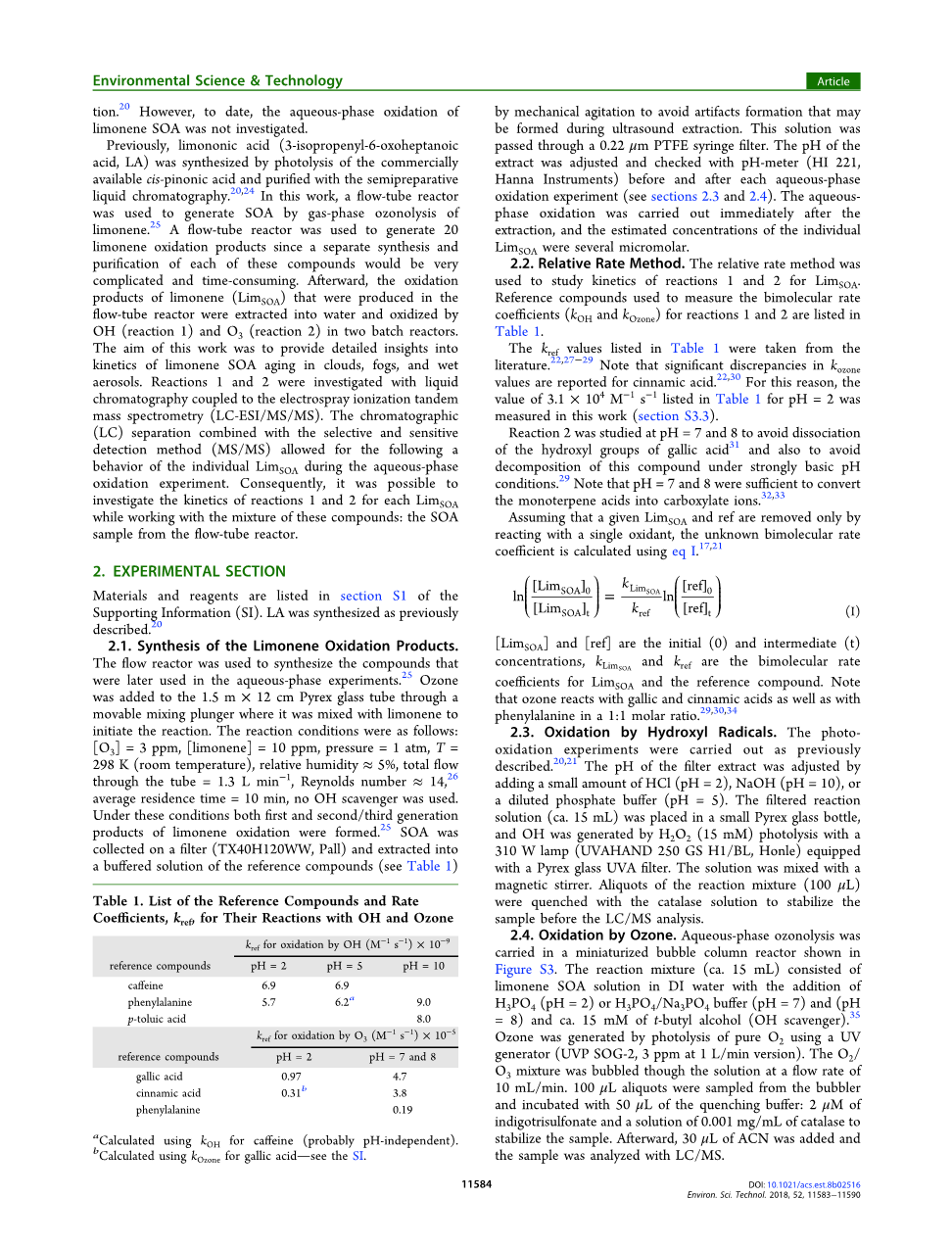 以前,柠檬酸(3-异丙烯基-6-氧代庚酸,LA)通过光解市售的顺式蒎酮酸合成,并用半制备液相色谱法纯化。 在这项工作中,使用流管反应器通过柠檬烯的气相O3分解产生SOA。使用流管反应器产生20种柠檬烯氧化产物,因为这些化合物中的每一种的单独合成和纯化将非常复杂和耗时。然后,将在流动管反应器中产生的柠檬烯(LimSOA)的氧化产物萃取到水中,并在两个间歇反应器中用OH(反应1)和O3(反应2)氧化。这项工作是为了提供有关云,雾和湿气溶胶中柠檬烯SOA老化动力学的详细见解。用液相色谱法和电喷雾电离串联质谱法(LC-ESI / MS / MS)研究反应1和2。用色谱(LC)分离与选择性和灵敏检测方法(MS/ MS) 相结合,在液相氧化实验中允许以下个体LimSOA 的行为。因此,可以研究每种LimSOA的反应1和2的动力学,同时使用这些化合物的混合物(来自流量管反应器的SOA样品)。