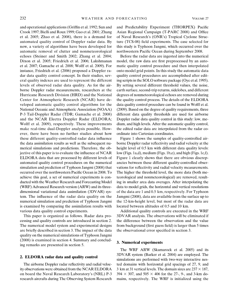 随着近距离实时海岸和机载多普勒雷达的TC观测资料越来越多,用于科学研究和操作应用(Griffin等1992; Sun和Crook 1997; Bielli和Roux 1999; Gao等2001; Zhang等。2005; Zhao等人,2008),需要对多普勒雷达数据进行自动质量控制。到目前为止,已经开发了多种用于自动去除杂波和非气象回波的算法(Steiner和Smith 2002; Zhang等人2004; Dixon等人2005; Friedrich等人2006; Lakshmanan等人2007; Gamache等人) al.2008; Wolff et al.2009)。例如,弗里德里希等人(2006)提出了一种多普勒雷达数据质量控制概念。在他们的研究中,使用了几个质量指标来表示观察到的雷达数据质量的不同水平。至于机载多普勒雷达测量,飓风研究部(HRD)和国家大气研究中心(NCAR)的研究人员分别为国家海洋和大气协会(NOAA)P-3尾部多普勒雷达开发了自动质量控制算法(TDR; Gamache等人,2008)和NCAR Electra多普勒雷达(ELDORA; Wolff等人,2009)。这些改进实现了实时双多普勒分析。但是,没有进一步研究这些不同的质量控制雷达数据如何影响数据同化结果以及随后的数值模拟和预测。因此,本文的目的是评估由不同级别的自动化质量控制程序处理的NCAR ELDORA数据对2008年西北太平洋海域发生的台风孟米(2008)的数值模拟和预测的影响。为了实现这一目标,利用天气研究和预报模式(WRF)高级研究版(ARW)及其三维变分数据同化(3DVAR)系统进行了一系列数值实验。通过比较同化结果和各种数据质量控制实验,研究了雷达数据质量对台风“孟米”数值模拟和预测的影响。本文的结构如下。雷达数据处理和质量控制在第2节中介绍。数值模型系统和实验设计在第3节中简要描述。数据质量对台风孟米(2008)数值模拟的影响将在第4节中进行讨论。结束语见第5节。