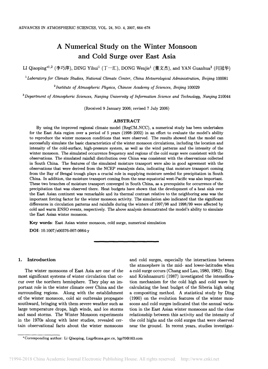 东亚冬季季风是北半球最重要的冬季环流系统之一,在中国及周边地区的冬季气候中发挥着重要作用。随着冬季季风的形成,冷空气爆发,寒潮向南传播,带来了恶劣天气,如大幅度降温,大风,冰雪风暴和沙尘暴。20世纪70年代的冬季季风实验以及后来的研究揭示了冬季季风和冷涌的观测事实,尤其是冷涌发生时中低纬度地区大气之间的相互作用。(Chang和Lau, 1980,1982)。Ding和Krishnamurti(1987)通过使用合成方法计算西伯利亚高压的热量平衡来研究冷高压和寒潮的增强机制。Ding(1990)对冬季风和冷涌的演变特征进行的统计研究表明,东亚冬季风的年际变化,其强度与近地面冷高压强度及冷涌的强度有着密切关系。近年来,探究东亚冬季风和冷涌的研究取得了新的进展(Wang和Ding,1997; Z-hang和Chen,1999; Chan和Li,2004)。冬季风与ENSO事件之间关系的统计和数值研究表明,此类事件对中国冬季降水和冬季风强度以及冷空气路径有显着影响。在厄尔尼诺现象期间,它也可能增加华南地区的冬季降雨量,但在拉尼娜年期间降雨量减少(Guo和Wang,1990; Zhang等,1996; Tao和Zhang,1998; Mu和Li,1999。与夏季风相比,对冬季风所做工作相对较少。