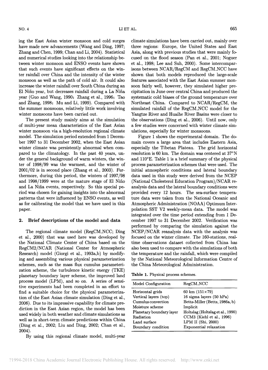 中国国家气候中心基于RegCM2 / NCAR(国家大气研究中心)模式(Giorgi等,1993a,b),修改和重组了各种物理参数化方案,(RegCM-NCC; Ding等,2000年)如积云质量通量参数化方案,湍流动能(TKE)行星边界层方案,改进的陆地过程模型(LPM)等。为了找到适合东亚气候模拟物理参数化,完成了一系列敏感实验(Ding 等,2006)。该模式在东亚地区具有较好的气候预测能力,已广泛应用于天气和气候模拟以及中国的短期气候预测中(Ding 等2002; Liu and Ding,2002; Chan等,2004)。
