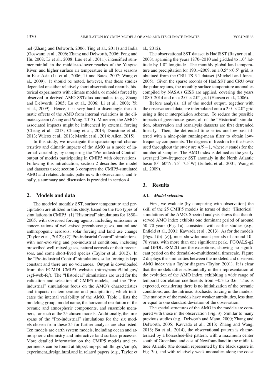 在这项研究中,通过比较参与CMIP5的模式的“工业化前控制”试验的输出结果与观察结果,AMO作为内部变率模式的我们研究了AMO的时空分布特征。文章结构:第2节描述了所使用的模式和数据集; 第3节将CMIP5模拟的AMO和相关的气候模式与观测结果进行了比较; 最后,第4节提供了总结和讨论。