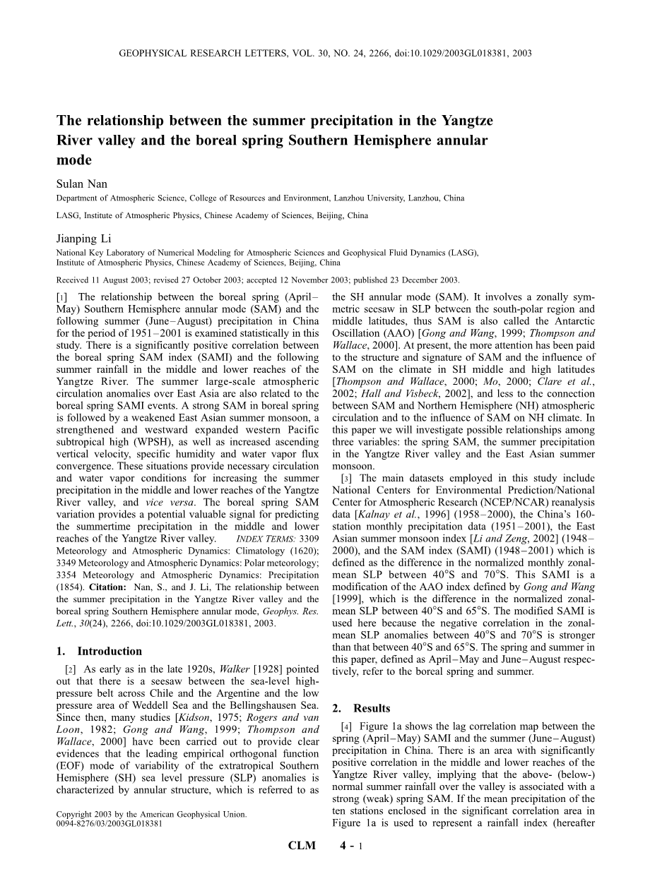 NAN AND LI: RELATION BETWEEN PRECIPITATION AND SAM CLM 4 - 3