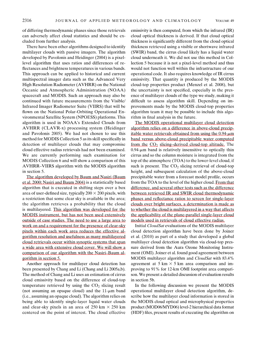 已经有其他算法用于利用被动成像仪识别多层云。由Pavolonis和Heidinger(2004)开发的算法使用了不同通道的反射率和亮度温度,这种方法可以应用于当前多光谱成像仪器,如高分辨率辐射计(AVHRR),海洋与大气管理局(NOAA)航天器和MODIS。这样的方法也可能运用到NPP上红外可见光成像仪辐射计(VIIRS),这个算法也可用于NOAA的 AVHRR(CLAVR-x)云处理系统(Heidinger et al., 2005)。