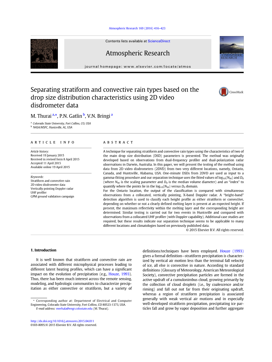 由于水凝物垂直分布的差异,对于不同的降水类型,反射回来的三维结构通常也不同,这产生了基于雷达探测降水的技术(例如,Steiner et al.,1995)。过去的许多研究还研究了使用地表测量仪器(Tokay和Short,1996; Bringi et al., 2003)或气载粒子成像探测器(例如,Testud et al.,2001;Atlas et al.,2000;Ulbrich和Atlas,2002;Yuter和Houze,1997)来探究层状云降水和对流云降水之间雨滴大小分布的差异。然而,Yuter和Houze(1997)却断言,无法根据液滴尺寸分布的特征量(如平均体积直径)来区分对流-层状云降水。另一方面, Bukovčić et al.(2015)利用2DVD雨滴谱数据,采用多变量贝叶斯分类算法来区分层状和对流降水,Caraccioloa et al.(2006)使用来自Joss-Waldvogel的雨滴观测数据检验了层状和对流降水的DSD特征。利用被动卫星微波测量来识别云顶高度的差异,以此来区分对流降水和层状降水的方法也已经开始使用了(Adler和Negri,1988)