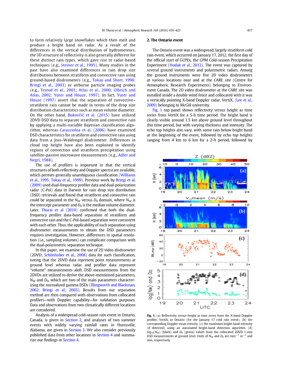Ontario的事件发生在2012年1月17日,即GCPEx(GPM冷季降水项目)正式开始的第一天,(Hudak et al.,2012)。该过程被几个地面仪器和极化雷达捕获。地面仪器中有五个2DVD,位于加拿大环境部附近的CARE场地(大气研究实验中心)附近的不同位置。CARE现场的2D视频光谱仪安装在双风栅栏内,与之相配的是一个属于麦吉尔大学的垂直指向的X波段多普勒雷达,VertiX(Lee et al.2009)。
