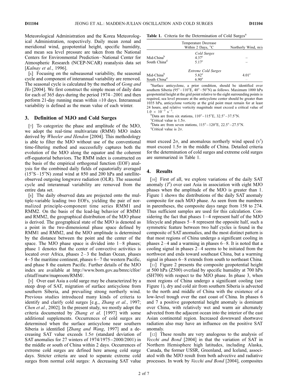 在东亚区地区的SAT异常表现出了与MJO相关联的环流异常的明显的空间变化,主要是通过低层的对流效应作为一个先决条件。除此之外,极端冷涌事件发生频率与MJO密切相关,比如在MJO的第2-3位相和MJO相关的预报条件为冷涌事件振幅的加大提供了有利的条件。