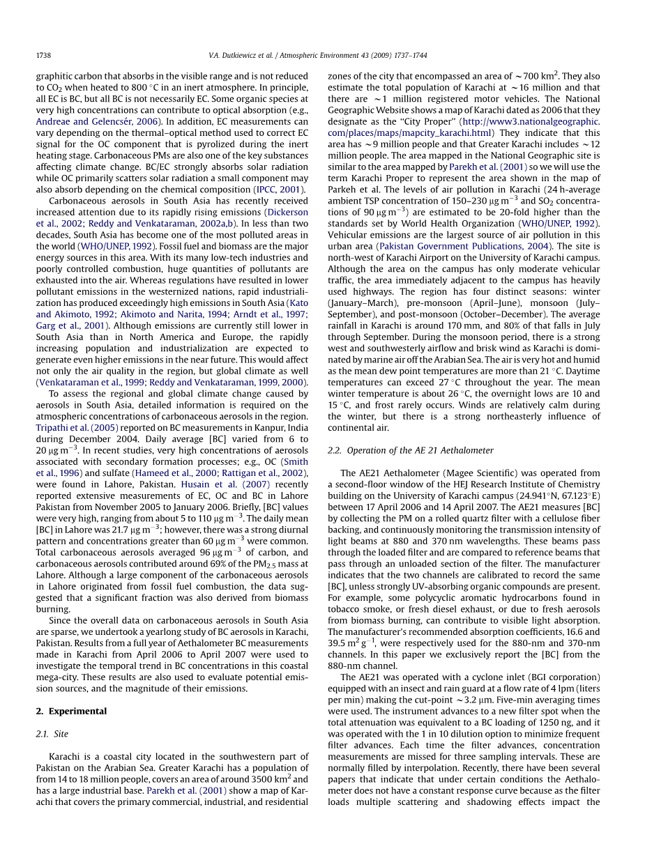 大气气溶胶或颗粒物质(PM)在化学上是复杂的,是固体和液体颗粒的动态混合物。PM的来源包括自然和人为过程;例如,海盐飞沫,来自风吹土壤产生的尘埃,燃烧产生的颗粒和光化学产生的颗粒。由于来源不同,PM具有各种形态和组成。它们可以包含无机离子,元素碳(黑烟),各种微量元素,地壳化合物,有机化合物和生物物质的某种组合。大气PM的直径可以在纳米到100微米的范围内。PM的寿命及其影响人类和环境在很大程度上取决于粒径的化学和物理性质的功能定义,还是存在细微差别。BC表示吸收可见光的碳质材料的分数;EC是当在惰性气氛中加热到800oC时,在可见光范围内吸收并且不会还原成CO2 的石墨碳。原则上,所有EC都是BC,但所有BC都不一定是EC。一些非常高浓度的有机物质可以促进光学吸收(例如,Andreae和Gelencser,2006).此外,EC测量可以根据用于校正在惰性加热阶段热解的OC组分的EC信号的热光学方法而变化。碳质PM也是影响气候变化的关键物质之一。BC / EC强烈吸收太阳辐射,而OC主要散射太阳辐射的一小部分也取决于化学成分吸收(ipcc, 2001年).由于排放迅速增加,南亚的碳质气溶胶最近受到越来越多的关注(迪克森 等,2002;Reddy和Venkataraman,2002a,b).在不到20年的时间里,南亚已成为世界上污染最严重的地区之一(WHO/UNEP,1992年).化石燃料和生物质是该地区的主要能源。由于其许多低技术产业和燃烧控制不良,大量污染物被排放到空气中。虽然法律法规导致西方国家的污染物排放量降低,但快速工业化在南亚产生了极高的排放量(Kato and Akimoto,1992;Akimoto and Narita,1994;Arndt等,1997;Garg等,2001).虽然南亚的排放量目前仍低于北美和欧洲,但人口和工业化的快速增长预计会在不久的将来产生更高的排放量。这不仅会影响该地区的空气质量,也会影响全球气候(Venkataraman等,1999;Reddy and Venkataraman,1999年,2000年).为了评估南亚气溶胶引起的区域和全球气候变化,需要详细了解该地区大气中碳质气溶胶的浓度。Tripathi等(2005年)报告了2004年12月印度坎普尔的BC测量结果。每日平均黑碳气溶胶浓度从6到20 mg/m3。在最近的研究中,非常高浓度的气溶胶与二次形成过程有关;例如,OC(Smith等,1996)和硫酸盐(Hameed等,2000;Rattigan等,2002),在巴基斯坦拉合尔被发现。Husain等。(2007年) 最近报道了2005年11月至2006年1月在巴基斯坦拉合尔进行的EC,OC和BC的广泛测量。简言之,黑碳气溶胶浓度值非常高,约为5至110 micro;g/m3。拉合尔的日平均黑碳气溶胶浓度为21.7micro;g/m3;然而,当有一个强烈的昼夜模式时,浓度大于60micro;g/m3是常见的。总碳质气溶胶的平均碳含量为96micro;g/m3,含碳气溶胶占拉合尔PM2.5 质量的69%左右。虽然拉合尔的碳质气溶胶中的一大部分来自化石燃料燃烧,但数据表明,很大一部分也来自生物质燃料燃烧。