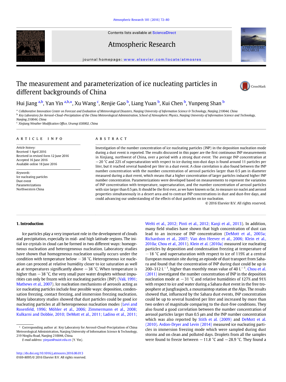 研究了粉尘事件中沉积成核粒子数浓度(INP)的变化。本文所讨论的是在中国西北新疆首次连续的INP测量,在一个强烈的沙尘暴事件期间。在无粉尘的日子里,在-20℃和22%的冰过饱和度下,INP的平均浓度约为每升11个颗粒,但在粉尘事件中达到了几百个。还发现INP数浓度与在灰尘事件期间测量的直径大于0.5微米的气溶胶粒子数浓度之间存在密切关联,这意味着较大粒子的浓度越高,INP数浓度越高。参数化是在测量的基础上发展起来的,以表示INP浓度随温度、过饱和以及尺寸大于0.5mu;m的气溶胶粒子数浓度的变化。正如我们所知,这应该是迄今为止第一次在沙漠地区同时测量冰核和气溶胶特性,并对比灰尘和无尘天的INP浓度,并且可以促进我们对灰尘粒子对冰核的影响的理解。
