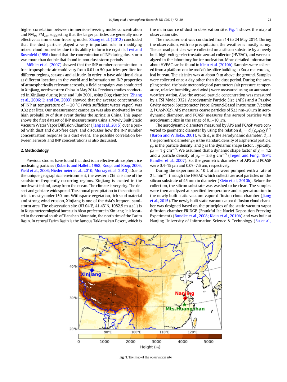 冰核在云和降水的发展中起着非常重要的作用,尤其是在中高纬度地区。云中的初始冰晶可以通过两种不同的方式形成:均匀成核和非均匀成核。实验室研究表明,均匀成核通常发生在温度低于38℃的条件下。非均匀冰成核也可以在接近冰饱和的相对湿度下进行 温度明显高于38℃。当温度高于38℃时,没有杂质的非常小的纯水滴只能用冰成核颗粒( INP )冷冻(Vali, 1991; Mathews et al., 2007)。作为冰成核颗粒的气溶胶的冰成核机制包括四种可能的方式:凝华核化、凝结冻结核化、浸润冻结核化以及接触冻结核化。许多实验室研究表明,在异质成核模式下,尘埃粒子可能是良好的冰核源颗粒(Levi and Rosenfeld, 1996; Mouml;hler et al., 2006; Zimmermann et al., 2008; Kulkarni and Dobbie, 2010; DeMott et al., 2011; Ladino et al., 2011; Welti et al., 2012; Pinti et al., 2012; Kanji et al., 2013)。此外,许多实地研究表明,高浓度的粉尘可导致INP浓度增加(DeMott et al., 2003a; Richardson et al., 2007; Van den Heever et al., 2006; Klein et al., 2010a; Chou et al., 2011) 。Klein等人2010年对在撒哈拉沙漠的沙尘输送过程中研究在-18°C的温度下沉积和冷凝冻结核化,以及在欧洲中部山区119 %的相对冰过饱和测量出冰核颗粒浓度,发现沙尘期间INP的浓度可能高达200-312L-1,高于每月平均值40L-1。Chou等人2011年在阿尔卑斯山上观测站获得撒哈拉尘埃运输期间沙漠对流层的冰核数据,得出在-31℃的沉积成核模式中相对冰面和水面相对湿度为127%和91%的INP浓度。结果表明,受撒哈拉沙尘事件的影响,与无尘条件相比,INP浓度可能高达几百升,增加了两个数量级以上。2010年,Stith和 DeMott 等人还发现,大于0.5微米的气溶胶粒子数浓度与INP数浓度相关。2014年,Ardon-Dryer和Levin在浸没冷冻模式下测量了在沙尘暴期间、洁净空气和有污染的空气时取样的冰核浓度,发现所有样品的液滴在温度为-11.8℃至-28.9℃间冻结,并发现浸泡-冷冻模式下冰核浓度与PM10-PM2.5之间气溶胶粒子的相关性更高,这表明较大粒子比小粒子更易出发浸没冷冻核机制。2012年,Zhang等人得出结论:尘埃粒子因其易形成冰核,而在改变混合云性质方面起重要作用。1996年,Levi 和 Rosenfeld发现沙尘暴期间的INP浓度是非尘暴期间的两倍以上。2007,Mouml;hler等人发现,对于不同的地区,季节和海拔高度,自由对流层空气中的INP数浓度可以从每升0.01到50个浓度范围内发生变化。为在世界不同地点获得更多数据和大气气溶胶的INP特性信息,2014年5月在中国西北部的新疆进行了一次野外活动。之前在新疆使用Bigg 冰室( Zhang等人,2006年;Li和Du,2003年)的研究表明,在-20°C (有足够的水蒸气)的条件下下,INP的平均浓度为0.32个/升。本研究的测量活动也是由中国春季发生粉尘事件的高概率引起,本文展示了使用新建的静态真空水蒸气扩散室进行INP测量的第一个数据集( Jiang等人,2015年),并讨论INP数浓度对灰尘事件的关系,还讨论了气溶胶和INP浓度之间的可能存在的相关性。