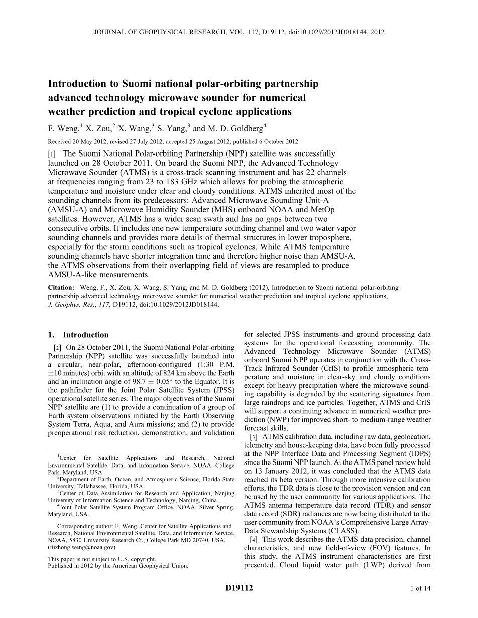 Suomi NPP卫星先进技术微波探测仪在数值天气预报和热带气旋研究中的应用简介