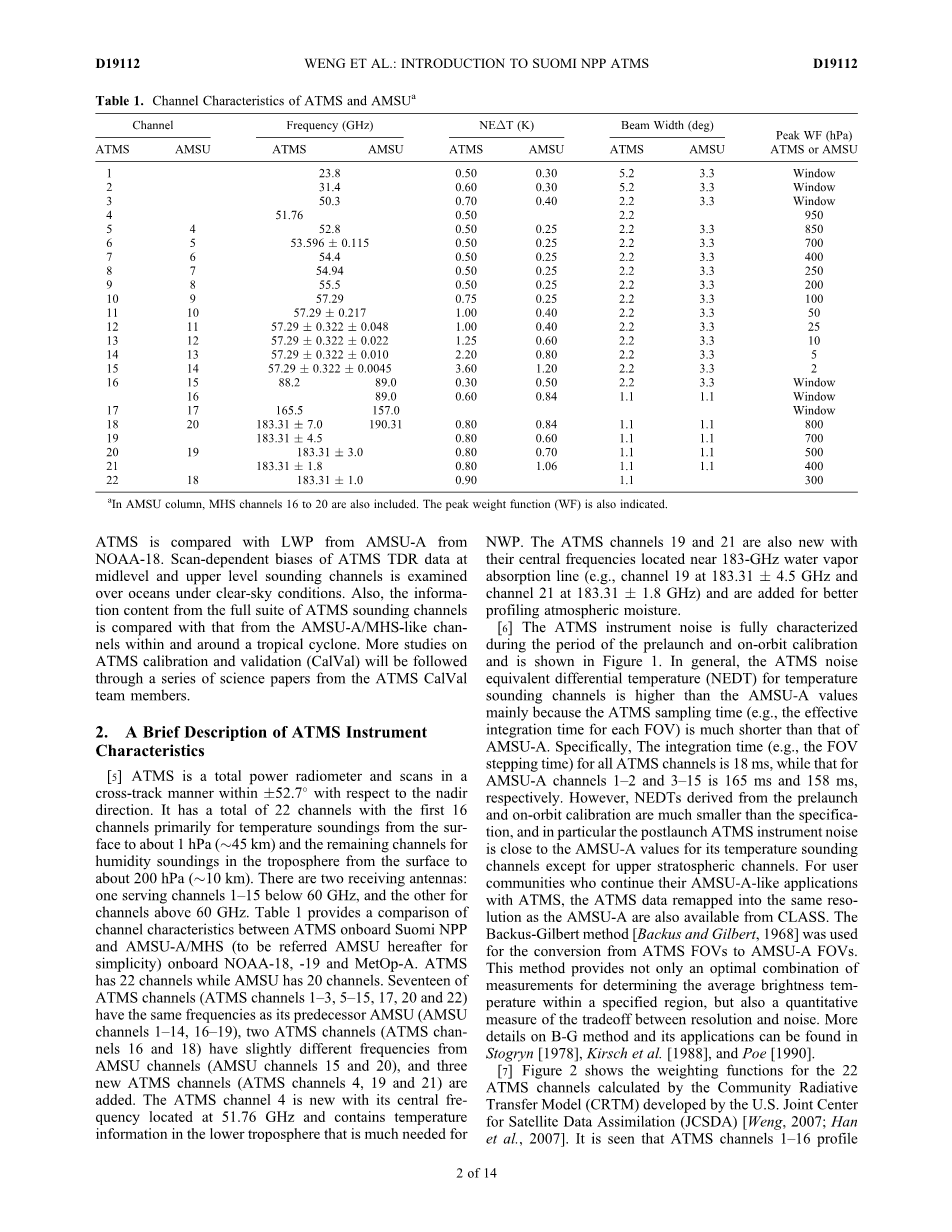 [8] AMSU通道1-15和16-20的波束宽度分别为和。ATMS通道3-16的波束宽度为,比AMSU温度通道1-15小。然而,ATMS地表通道1-2的波束宽度为,远远大于相应的AMSU通道1-2。在60GHz以上的7个ATMS信道中的6个通道,通道17-22,具有的波束宽度,这与AMSU水汽通道16-20相同。