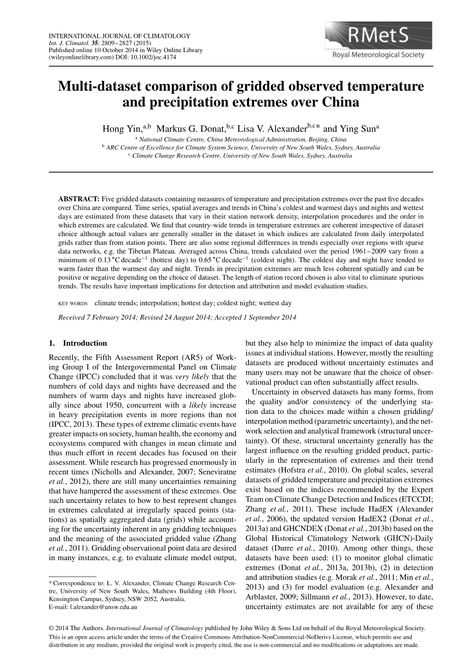 最近,政府间气候变化专门委员会(IPCC)第一工作组的第五次报告(AR5)中提到,自1950年以来,冷昼和冷夜的数量逐渐减少,热昼,热夜的数量逐渐增加,同时强降水事件将在更多的地区发安生。与平均气候变化相比,这些极端气候事件对人类健康、社会、经济和生态系统产生了更大的影响,因此近几十年来更多的研究对集中在了这份评估上。虽然最近研究进展很快(尼克尔斯和亚历山大,2007;维拉特纳等,2012),但仍有许多不确定因素阻碍了对这些极端事件的评估。其中一个不确定因素就是如何最好地把在不规则格点(站点)中计算的极值变化表示在空间插值中(网格),同时还要考虑网格技术中本来存在的一些不确定性和相关格点的使用价值(张等,2011)。许多情况下都需要用到格点数据,例如:评估气候模式的输出,但是他们也有助于最大限度地减少个别站点数据质量问题所造成的影响。然而,大多数生成的模式数据是在没有进行不确定性估计的情况下产生的,并且许多实验者可能不会意识到数据观测产品的选择通常也会对结果产生实质性的影响。观测数据的不确定性有很多种形式,从基础站台数据的质量和/或一致性到选择的网格/插值方法的选择(参数不确定性),和网格选择和分析框架(结构不确定性)。其中结构不确定性通常对最终的格点化产品,特别是在极端情况的表示及其变化趋势的估计中影响最大。(霍夫特斯拉等,2010)。在全球范围内,基于气候变化检测和指标专家组(ETCCDI;张等,2011)建议的指标,有几个温度和降水极值的格点数据资料。这些指标包括了HadEx (亚历山大等,2006),更新版本HadEx2 (多纳特等,2013a)和GHCNDEX(多纳特等,2013b),基于全球历史气候学网络(GHCN)的每日数据(杜蕾等,2010)。除此之外,已经用到的数据资料包括:(1)监测全球气候极值(多纳特等,2013a,2013b),(2)检测和归因研究(如,莫拉克特,2011;米内特等,2013)和(3)用于模型评估(如亚历山大和阿博拉斯特,2009;司丽曼等,2013)。然后,迄今为止,虽然已经与其他可用的资料进行了比较,但是仍然不对这些产品中的任何一个进行不确定性估计(例如,多纳特等,2014)。对于世界上的一些区域来讲(例如非洲,南美洲和亚洲的部分地区),由于极端情况调查所需要的高质量的日常观测资料十分有限,因此研究受到了很大的限制。有许多高分辨率和时间尺度较短的区域尺度模式,例如0.05°*0.05°分辨率的澳大利亚水资源可用性项目数据包括1900年每日的多个气候变量(琼斯等,2009);欧洲每日的高分辨率(0,。25°*0.25°和0.5°*0.5°)的降水和温度的网格数据(E-OBS)(海诺克等,2008);和APHRODITE,0,。25°*0.25°和0.5°*0.5°分辨率的日降水数据,根据亚洲的测量观测结果实时更新(雅嗒盖等,2012)。中国已经开发出了一种高分辨率(0.5∘*0.5∘)的日最大和最小温度的网格数据(CN05)(许等,2009),已用于区域气候模式评估(例如陈等,2011;高等,2011)。然而,这些产品中的大多数同样产生了没有相关的不确定性信息。最近,在1951年至2010年期间,已经为825个台站开发和更新了中国日常地面气温均匀化及极端温度指数趋势分析(李等,2009;许等,2013)。数据均匀化已被证明可以改善中国趋势估计的空间一致性。