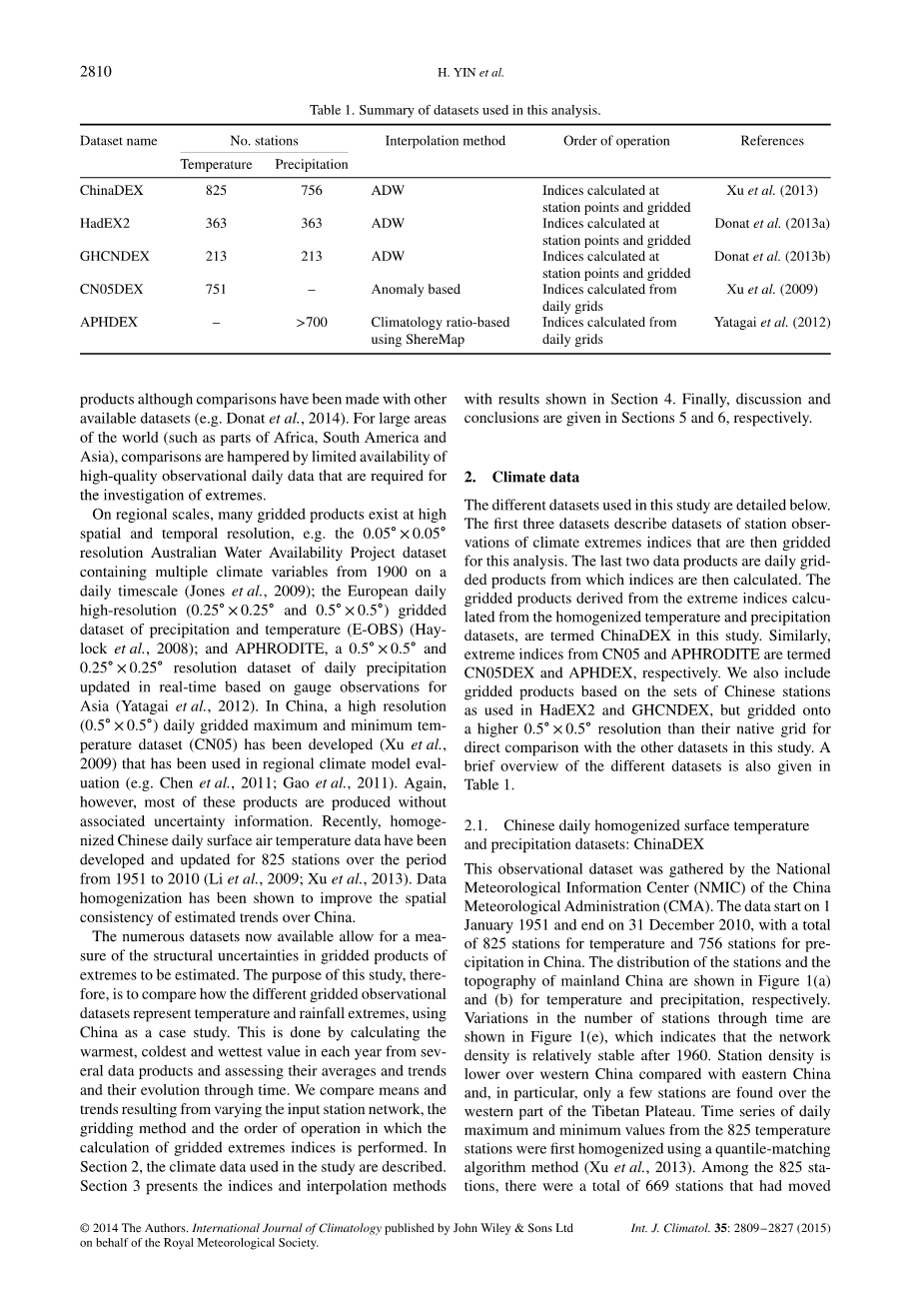 现在有很多数据可以估算出极值网格化产品的结构不确定性。因此,本文研究的目的是以中国为例,比较不同的格点观测资料如何的代表温度和降雨极值。从几个数据产品中计算每年中最温暖、最冷、和最潮湿的值 并评估其平均值和趋势及其随时间演变过过程。我们比较了通过改变站台网络,网格化方法和执行网格化极值指数计算的操作顺序而得出的平均值和变化的趋势。在第二节中,描述了气候数据使用的研究。第三节介绍了指标和插值方法,结果显示在第四节中。最后,讨论和结论分别在第五节和第六节中给出。