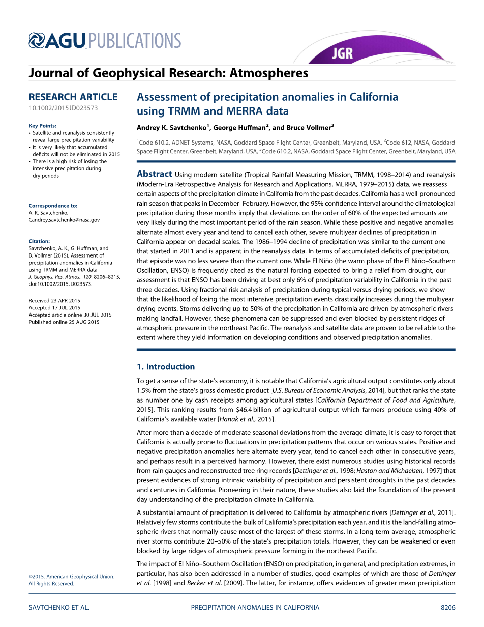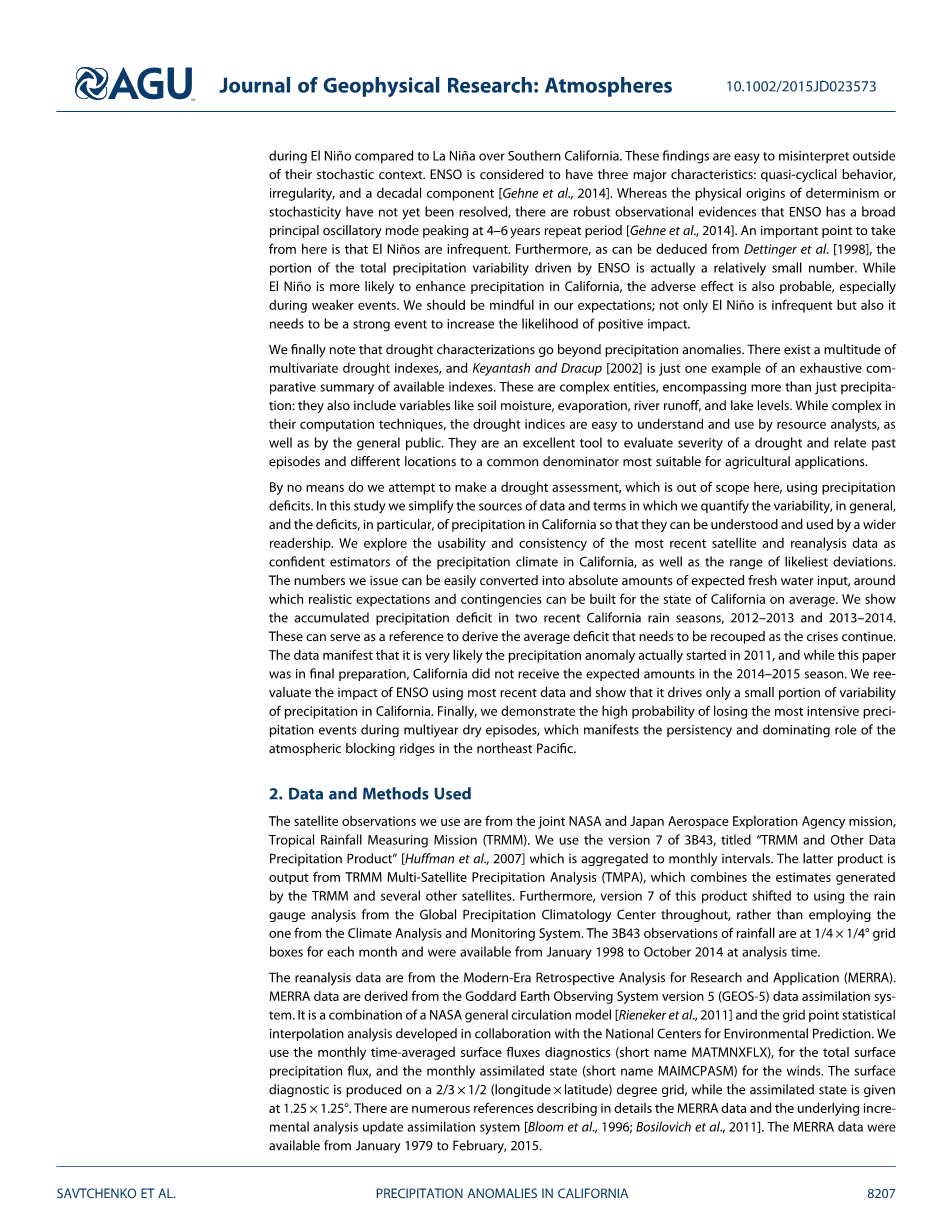 利用现代卫星(热带降雨测量任务,TRMM,1998-2014年)和再分析(现代回顾性研究与应用分析,MERRA,1979-2015年),我们从某些方面重新评估了过去几十年加州的降水气候。加州有一个非常明显的雨季,在十二月到二月达到顶峰。然而,这几个月气候降水的95%置信区间意味着,在雨季最重要的时期很可能偏离预期量的60%左右。虽然这些正、负异常几乎每年交替,且倾向于相互抵消,但加利福尼亚的多年降水严重下降出现在年代际尺度上。1986-1994年降水量的下降与2011年开始的降水下降相似,在再分析数据中也很明显。就降水量累积赤字而言,这一事件的严重性不亚于当前的一次。虽然厄尔尼诺现象(厄尔尼诺-南方涛动的暖期,ENSO)经常被认为是一种自然的强迫,预计能减轻干旱,我们的评估是:在过去30年来,ENSO对加州降水的影响最多只有6%。通过对典型降水和干燥期降水的部分风险分析,我们发现在多年干燥事件中,损失最强烈降水事件的可能性在急剧增加。在加州,高达50%的降水是由大气中的河流造成的,这些河流正在登陆。然而,这些现象可以被东北太平洋持续存在的气压脊所抑制甚至阻断。再分析和卫星数据被证明是可靠的,因为它们提供了关于发展条件和观测到的降水异常的信息。
