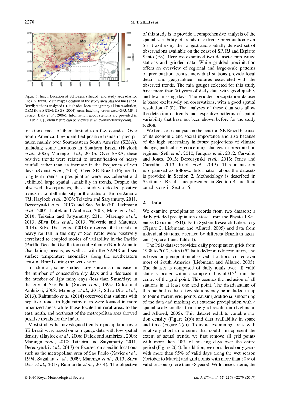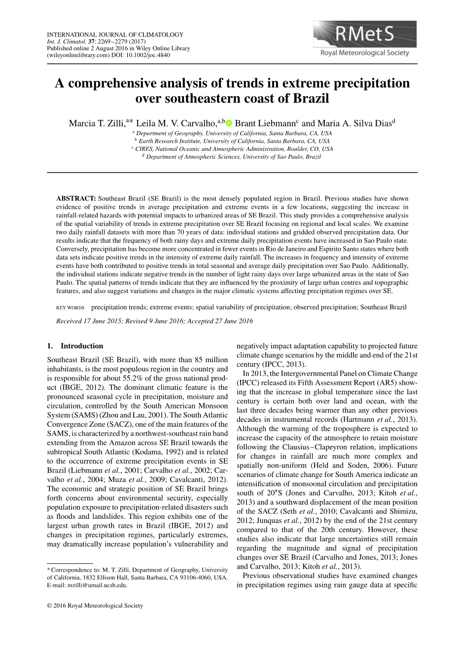 关键词降水趋势; 极端事件; 降水的空间变异性; 观测到降水; 巴西东南部