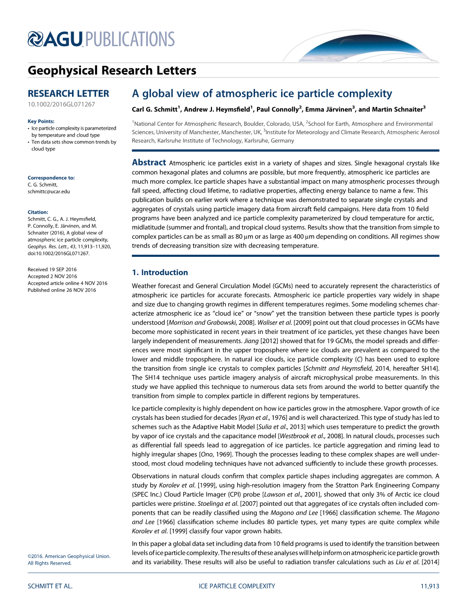 天气预报和大气环流模式(GCMs)需要准确地代表大气冰粒子对准确预测的特点。大气冰粒子由于在不同的模式下增长方式不同,因而在形状和大小上差别很大,。一些建模方案将大气冰描述为“云冰”或“雪”,然而却这些粒子之间的过渡类型知之甚少(莫里森和格拉博夫斯基,2008),威尔斯等[2009]指出,云过程模型近年来在处理冰颗粒上变得更加成熟,然而,这些变化在很大程度上独立于测量。江[2012]显示了19全球大气环流模型,该模型传播和差异是最重要的在对流层上层冰云是普遍的,相对于中低对流层而言的话。在自然冰云,冰粒子的复杂性(C)被用来探索从单一的冰晶过渡到复杂的粒子(施密特和赫穆斯菲尔德,2014年以后SH14)。飞机的SH14技术使用粒子图像分析微观物理学的探针测量。在这项研究中我们有这种技术应用于众多来自世界各地的数据集,以更好地量化的转变从简单到复杂粒子在不同地区的温度。