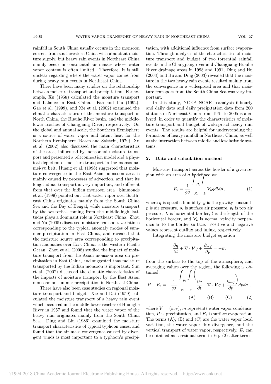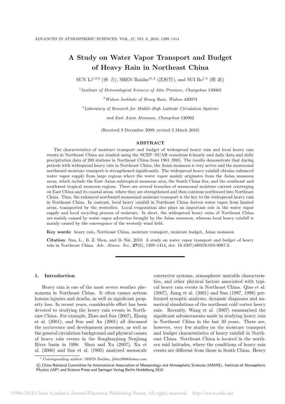 (原文Sun Li.A Study on Water Vapor Transport and Budget of Heavy Rain in Northeast China[J].ADVANCES IN ATMOSPHERIC SCIENCES,2010,27(6):1399-1414)