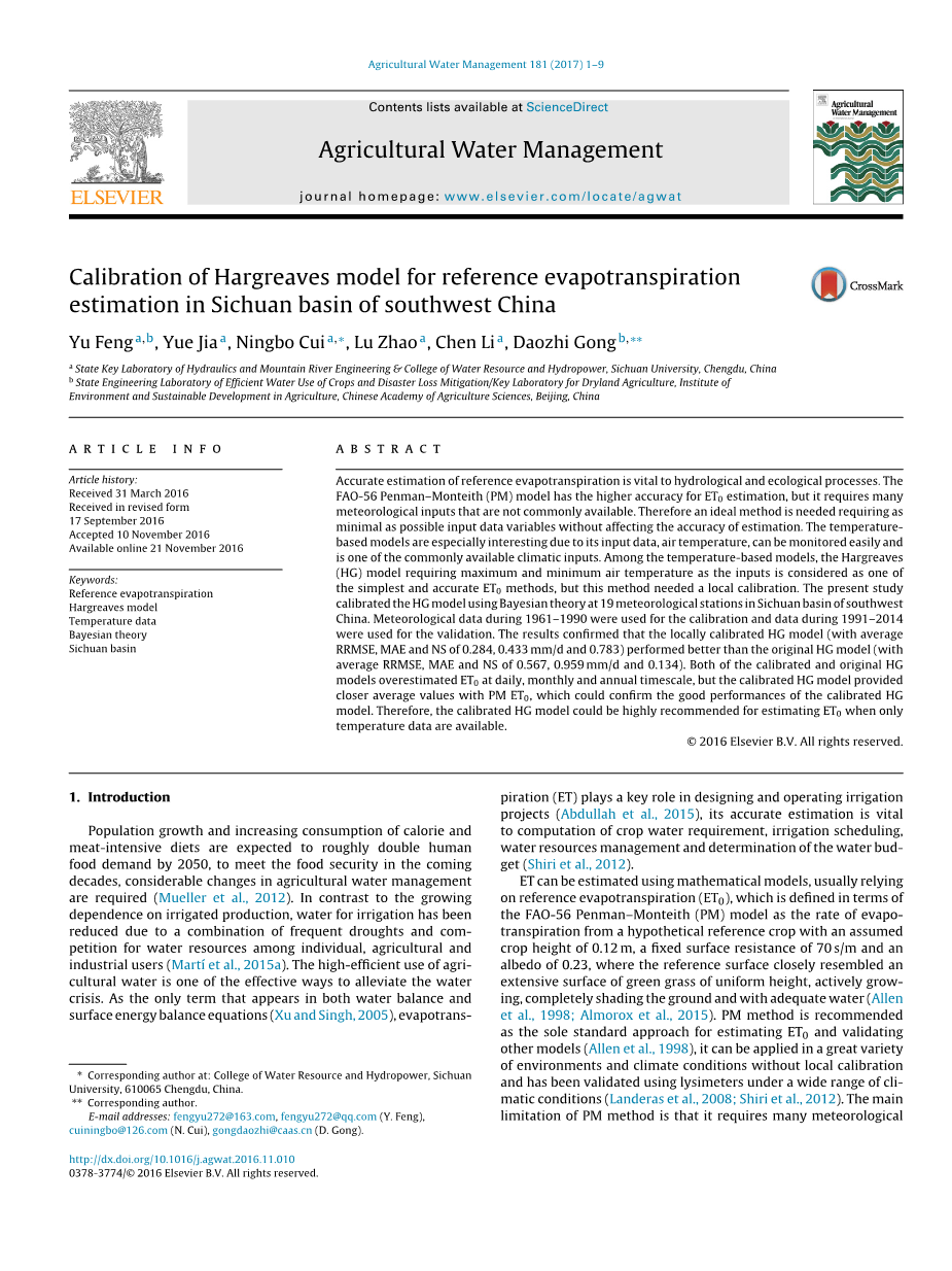 可以使用数学模型估算ET,通常依赖于根据FAO-56 Penman-Monteith(PM)模型定义的潜在蒸散量()作为假定参考作物的蒸散速率,假定作物高度为0.12米,固定表面电阻为70 s / m,反照率为0.23,参考表面非常类似于高度一致的绿色草地的广阔表面,积极生长,完全遮蔽地面并充足水分(Allen et al., 1998; Almorox et al., 2015)。 PM方法被推荐作为估算和验证其他模型的唯一标准方法(Allen et al., 1998),它可以应用于各种环境和气候条件下,无需本地校准,并且已经使用宽测量仪进行了验证气候条件范围(Landeras et al., 2008; Shiri et al., 2012)。 PM方法的主要局限是它需要很多不常用的气象输入,特别是在发展中国家(Droogers and Allen, 2002; Almorox et al., 2015)。应该根据输入数据变量尽可能少地选择用于估计的理想方法,并且不影响估计的准确性(Shih,1984; Traore et al., 2010)。因此,基于温度的模型由于其所需的输入数据(空气温度)可以容易且广泛地测量(Mendicino and Senatore, 2013; Almorox et al., 2015),因此是非常特别的。空气温度和太阳辐射解释了变率的至少80%(Priestley and Taylor, 1972; Samani, 2000; Martiacute; et al., 2015b),Hargreaves and Samani(1985)引入了最大,最小温度和地球外辐射来计算太阳辐射,然后他们建立了着名的Hargreaves(缩写为HG)模型来进行估计。它被认为是最简单和准确的估算方法之一(Jensen et al., 1997),并且可以应用温度预报(Luo et al., 2014)应用于的短期预报。 Allen等人(1998)建议当PM模型所需的数据集不完全可用时,将HG模型作为PM替代方法进行估计。 Almorox等人(2015)评估了11种用于估算的基于温度的代表性方法,HG模型在干旱,半干旱,温带,寒冷和极地气候条件下提供了最准确的全球平均表现。尽管已经报道了它的良好的性能,但还是建议HG模型进行局部校准(Allen et al., 1998; Samani, 2000; Hargreaves and Allen, 2003),并应用5天或更长时间的计算(Hargreaves and Allen, 2003)。 HG模型倾向于在高风条件下(风速gt; 3 m / s)低估ET0,并且在高相对湿度或低蒸散率条件下过高估计(Allen et al., 1998; Droogers and Allen, 2002 ; Xu and Singh, 2002; Zhao et al., 2012; Almorox et al., 2015),因此非常需要适合当地日常计算的HG模型的局部校准。