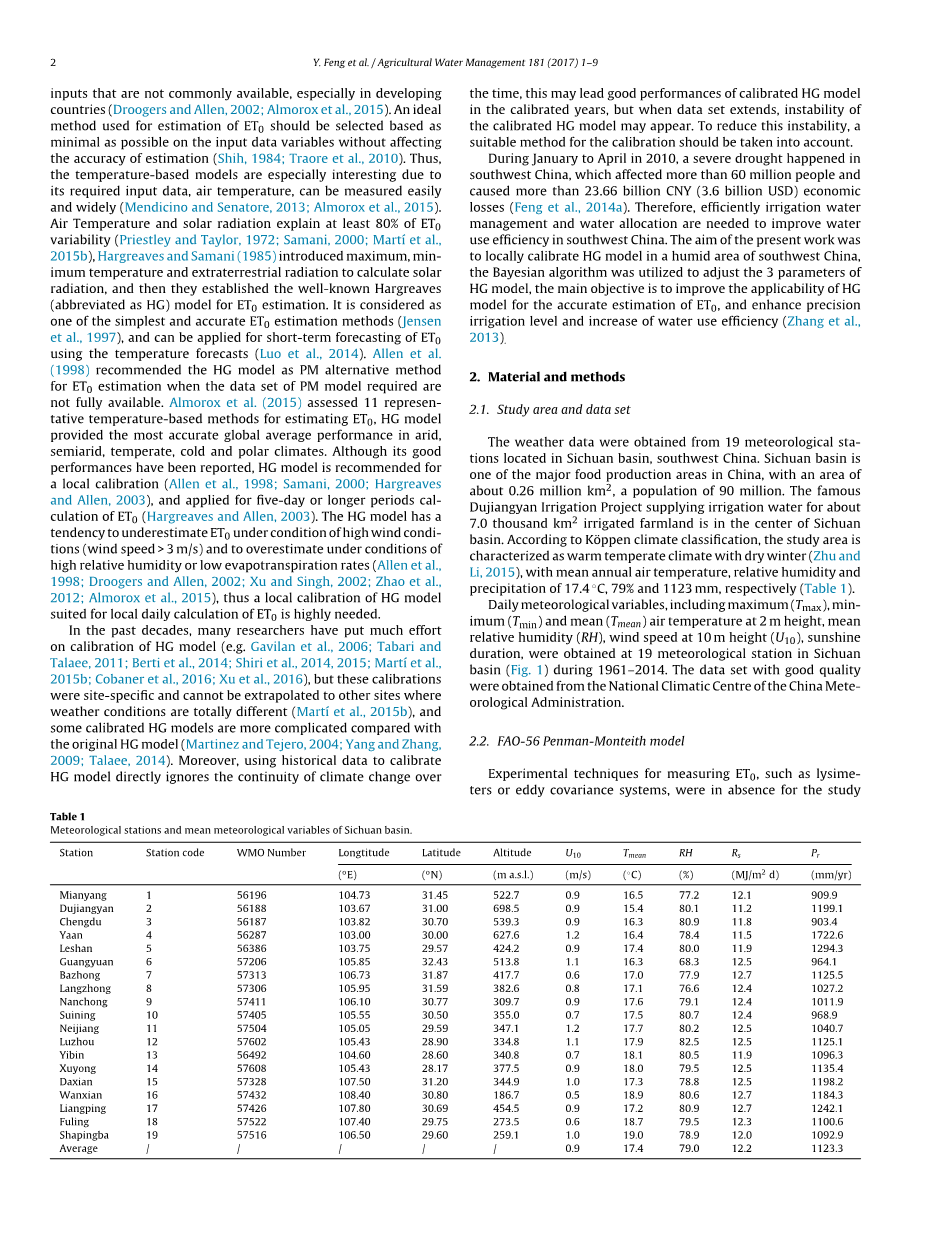 2010年1月至4月,中国西南发生了严重干旱,影响了6000多万人,造成经济损失超过236.66亿元人民币(36亿美元)(Feng et al., 2014a)。 因此,需要有效的灌溉水管理和水资源分配来提高西南地区的水资源利用效率。 本工作的目的是在中国西南某湿润地区对HG模型进行局部标定,利用贝叶斯算法对HG模型的3个参数进行调整,主要目的是提高HG模型对于精确估计的适用性,提高灌溉水平和提高水分利用效率(Zhang et al., 2013)。