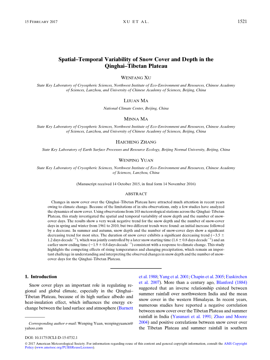 雪盖对于调节区域和全球气候起着非常重要的作用,尤其是位于青藏高原的雪盖,因为其隔热效果和较高的地表反射率影响了地表和大气之间的能量交换(Barnett et al.1988; Yang et al.2001; Chapin et al.2005; Euskirchen et al.2007)。一个多世纪以前,Blanford (1884)提出在印度西北部地区的夏季降水和喜马拉雅山脉西部平均积雪之间存在着相反的关系。近几年,众多的研究报告都显示出青藏高原积雪和印度夏季降水之间呈负相关关系(Yasunari et al.1991; Zhao and Moore 2004)以及青藏高原积雪和中国南方夏季降水之间呈正相关关系(Bamzai and Shukla 1999; Robock et al.2003; Zhao and Moore 2004)。此外,积雪也对水文过程,植物物候和碳循环有巨大的影响(Goulden et al.1998; Barnett et al.2005; Monson et al.2006; Rawlins et al.2006; Dorrepaal et al.2009; Peng et al.2013)。