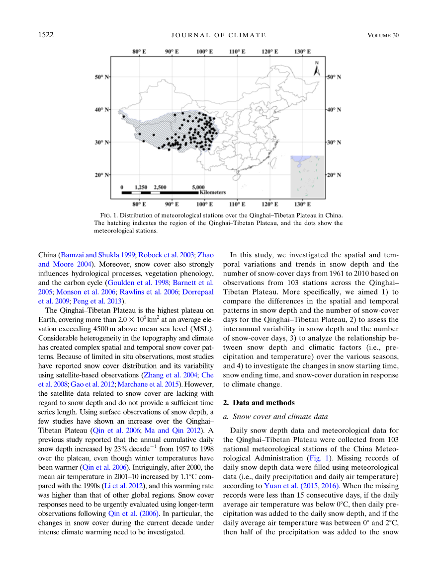 在本次研究中,我们基于青藏高原上103个气象站的观测资料,研究了从1961年到2010年的雪深和积雪天数的时空变化及趋势。更具体地说,我们的目的有:1.比较青藏高原雪深和积雪天数在时间和空间模式之间的不同;2.评估雪深和积雪天数的年际变化;3.分析不同季节的雪深和气候因素(即降水和温度)之间的联系;4.研究降雪开始时间、降雪结束时间和积雪持续时间对于气候变化的响应所产生的改变。