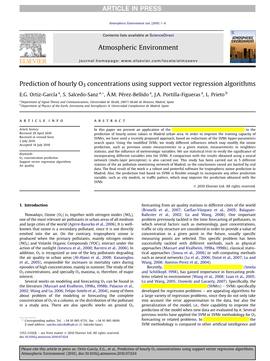对城市污染物空间分布的研究考虑了两类监测网络来获取数据:常规网络和目的设计网络(Hoek等人,2008)。 本研究中使用的马德里空气污染监测网络是一个常规网络,它在有部署站点的城市的不同地点提供每小时O3测量。 一些其他研究已经使用了常规监测网络的数据,例如(Beelen等,2007; Agirre-Basurko等,2006; Coman等,2008; Ibarra-Berastegi等人,2008; Moore等人,2007)。