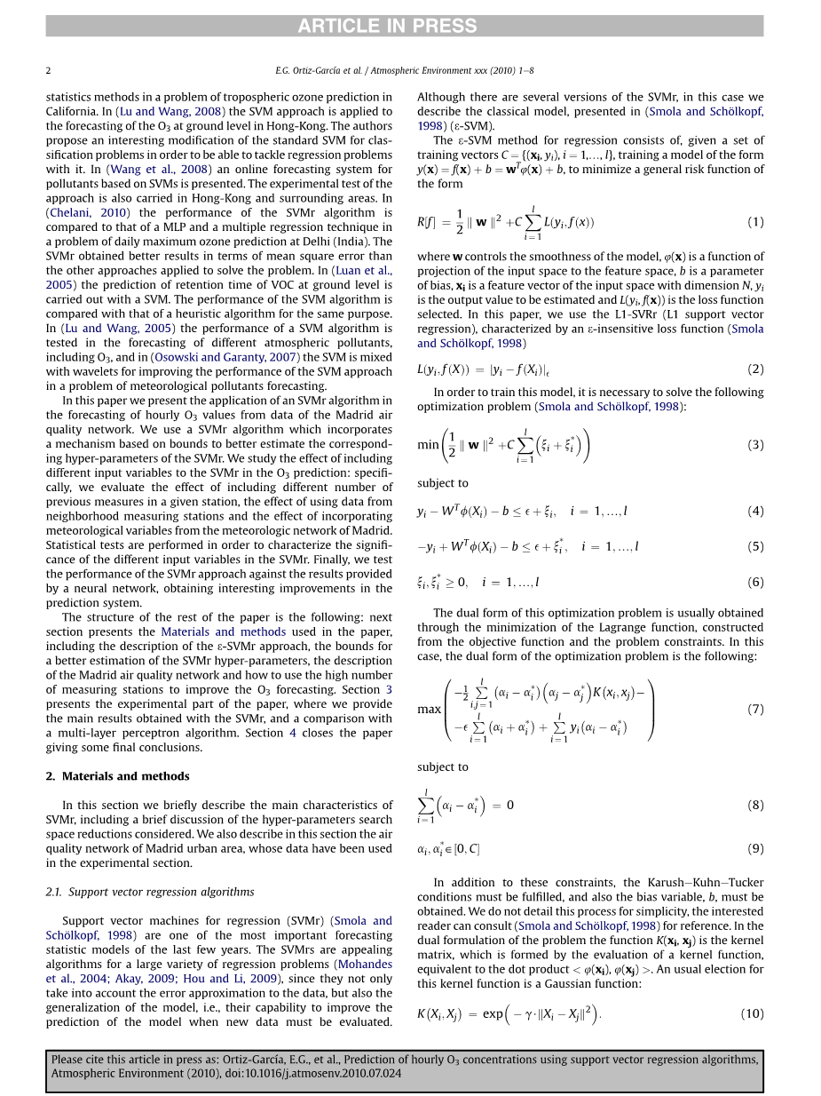 最近,支持向量机范例(SVMs)(Smola和Schouml;lkopf,1998年)在预测与环境有关的问题方面发挥了重要作用(Wang等人,2008; Luan等人,2005; Lu和Wang,2005; Osowski和Garanty,2007年)。 特别是针对回归问题开发的支持向量回归算法(SVMrs)。该算法特别适用于各种回归问题,因为它们不仅考虑了数据的误差近似值,而且还考虑了模型的普遍化。当对新数据进行评估时,该算法有能力改进模型的预测。 以前的一些工作已经将SVM或SVMr方法应用于O3预测或相关问题。 Salazar-Ruiz等人(Salazar-Ruiz等,2008)将SVM方法与其他的人工智能和统计方法在加州的对流层臭氧预测问题上进行研究。Lu和Wang(Lu和Wang,2008)认为SVM方法适用于香港地面O3的预测。 作者提出了对分类问题的标准支持向量机进行创新性的修改,以便能够解决回归问题。Wang等人(Wang等,2008)提出了一种基于支持向量机的污染物在线预测系统,该方法的实验测试也在香港及周边地区进行。在与德里(印度)每日最大臭氧预测问题中的MLP和多元回归技术相比。, SVMr在均方误差方面获得比用于解决该问题的其他方法更好的结果。 Luan等人(Luan等, 2005)使用SVM对地面水平VOC的保留时间进行预测。 为了相同的目的,将SVM算法的性能与启发式算法的性能进行比较。Lu和Wang(Lu和Wang,2005年)在不同大气污染物的预测中测试了SVM算法的性能,包括O3和(Osowski和Garanty,2007年)支持向量机与小波混合,用于提高支持向量机方法在气象污染物预测问题中的性能。