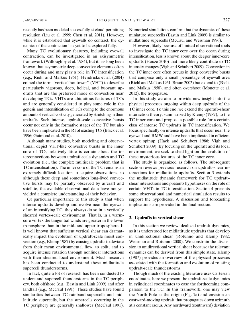 很多TC类似眼壁收缩的演变特性可以在一个轴对称的框架中研究(Willoughby et al . 1984),但我们早知道,不对称的深对流现象通常会在TC强化过程中发生并且对其强化起到一定作用(如,Riehl and Malkus. 1961)。Hendricks et al.(2004) 提出了“旋涡热塔”(VHT)来描述在发展中TC附近特别强,特别深的螺旋式活跃的对流上升气流。“旋涡热塔”(VHT)是TC普遍存在的特征,而“旋涡热塔”(VHT)能使大量垂直涡度在上升气流中伸展产生,因此“旋涡热塔”(VHT)通常被认为在TC产生和强化过程中起到重要作用。不仅会在TC产生阶段产生这样强烈的上升对流爆发,而且在TC急速加强(RI)阶段也会产生(Black et al . 1996;Guimond et al . 2010)。