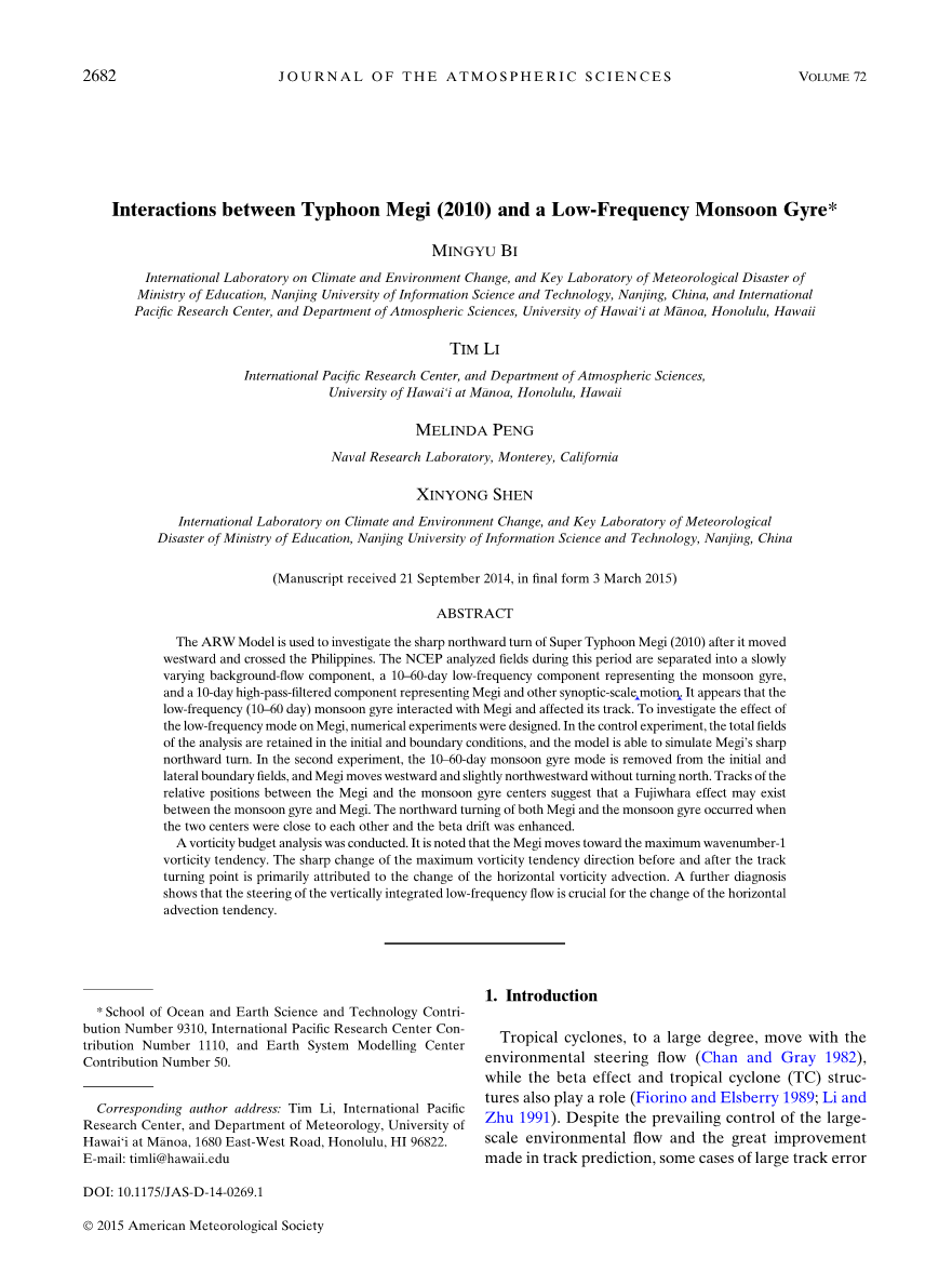 摘要ARW模式被用作调查超级台风Megi在西移并经过菲律宾之后的突然北移。NCEP在这个阶段分析的东西被分成不同背景流场的不同成分,一个10到60天的低频尺度分量代表季风涡旋,和一个十天的高通滤成分代表Megi和其他天气尺度运动。很明显,低频季风涡旋和Megi相互作用,并影响他的路径。为了调查低频系统对Megi的影响,设计了很多实验。在对照试验中,分析的领域被限制在初值和边值条件,模式可以模拟Megi的突然北抬。在第二个试验中,10到60天的季风涡旋被从初值和边值中移除,Megi西移,轻微的向西北移,没有转北。Megi和季风涡旋之间的相关位置关系表明Fujiwhare效应可能存在在季风涡旋和Megi之间。当Megi和季风涡旋靠近彼此,beta漂移加强,两个系统向北转。